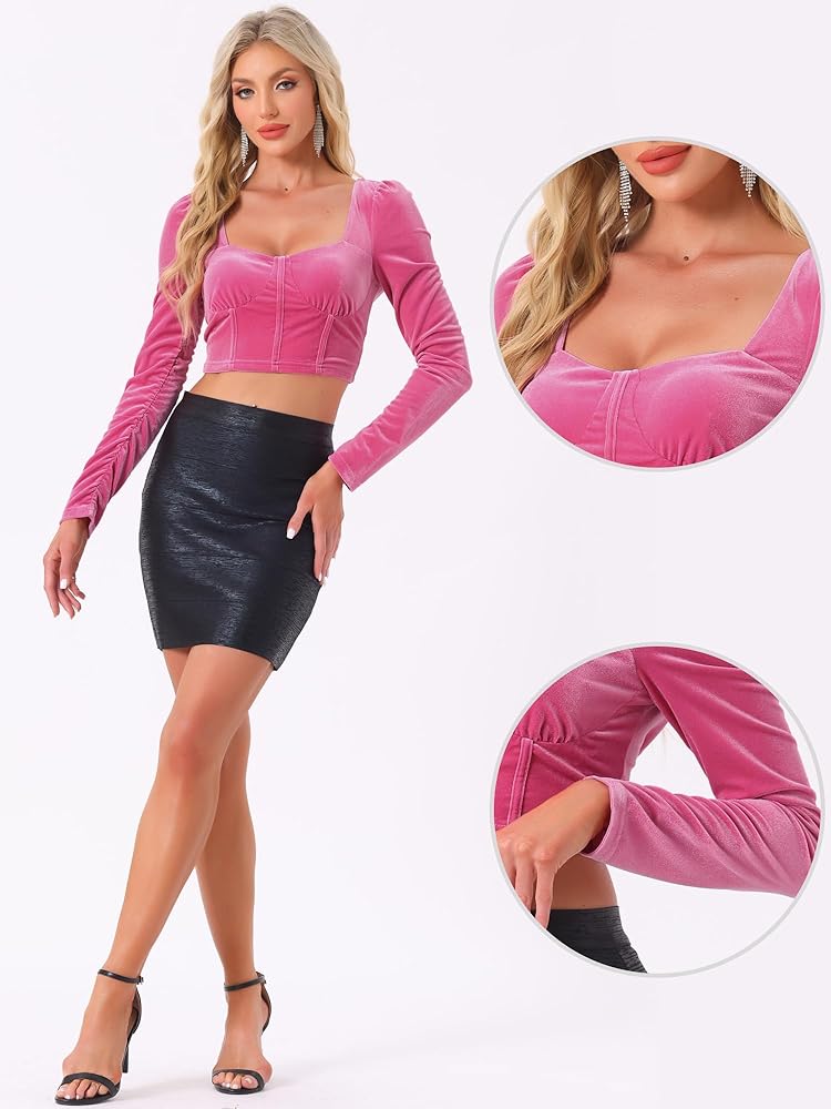 Allegra K Ruched Sleeve for Women's Sweetheart Neck Party Velvet Crop Tops