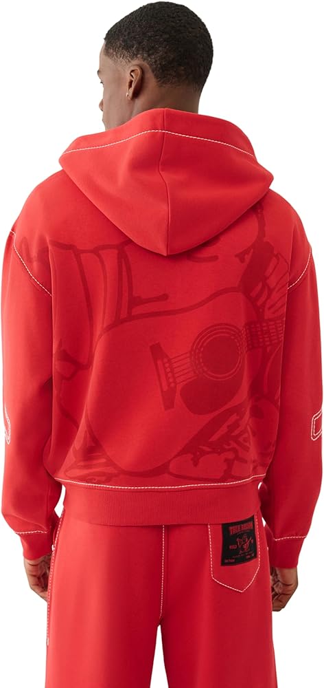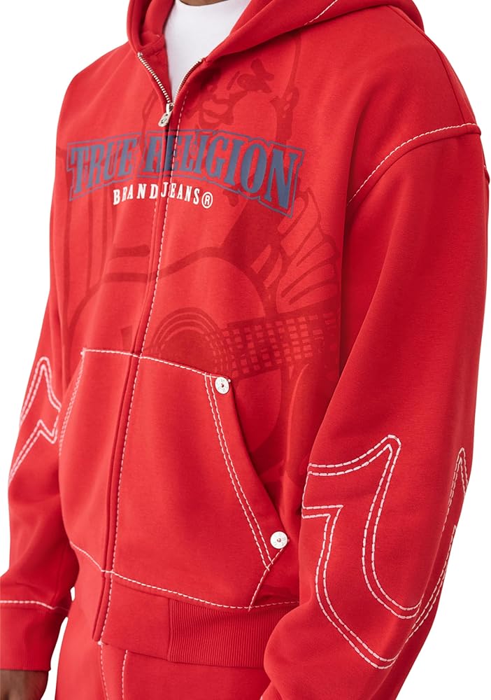 True Religion Men's Cinched Big T Zip Up Hoodie. This standout hoodie features the brand's signature Big T contrast stitching for an edgy, streetwear-inspired look. The cinched hood offers adjustable coverage, while the full-zip front makes it perfect for layering. Finished with ribbed cuffs and hem, it's crafted from a soft cotton blend for everyday comfort and style.