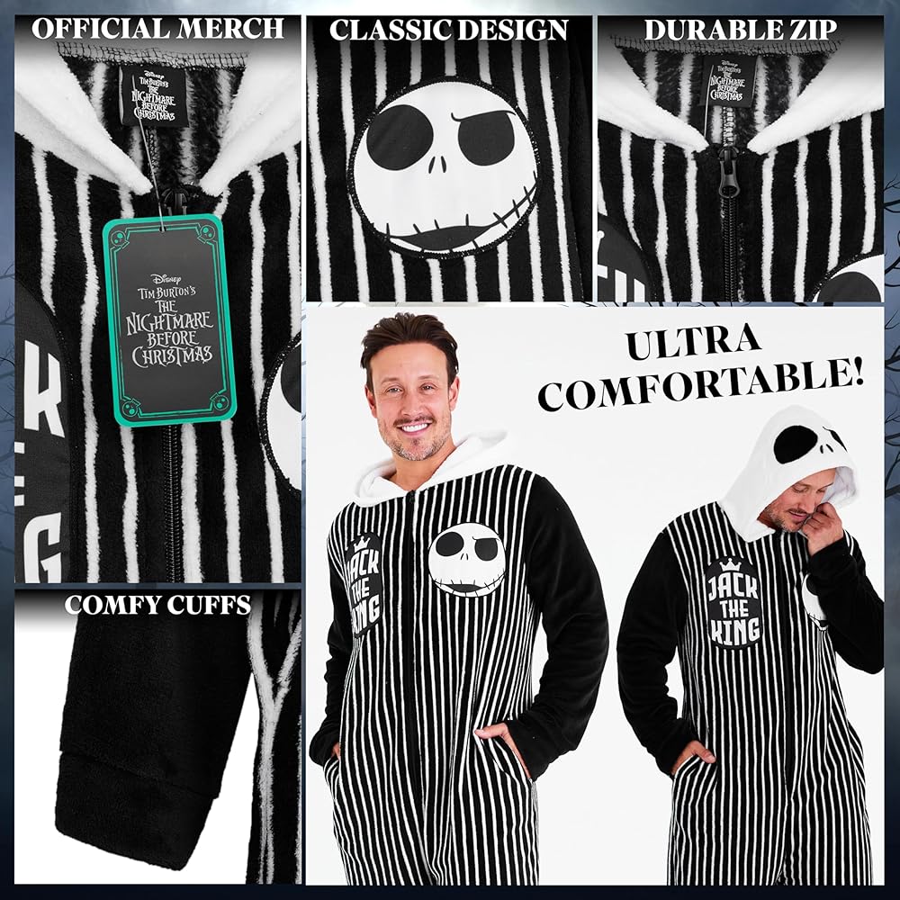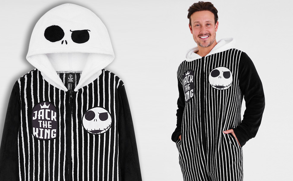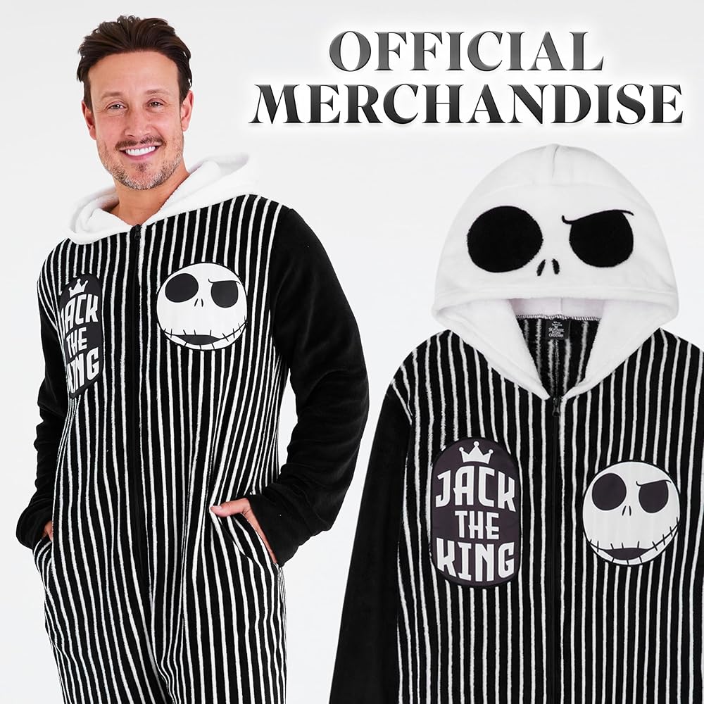 Step into comfort and style with this Disney The Nightmare Before Christmas men's fleece one-piece pajamas, a must-have for fans of Jack Skellington. Crafted from 100% polyester, this jumpsuit is soft, warm, and designed to keep you cozy during cooler nights. Whether you're relaxing at home, watching movies, or sleeping, this fleece pajama brings together playful Disney design and practical comfort. The design includes a hood for extra warmth and two side pockets for convenience, making it just as functional as it is stylish. Featuring black and white tones inspired by the film's unique aesthetic, this jumpsuit makes a statement while keeping you comfortable. Available in a full size range from S to 2XL, it's easy to find the right fit for teens and men alike. These pajamas are versatile enough for multiple occasions. Wear them for lounging around the house, staying snug on cold winter evenings, or dressing up with a playful twist for Halloween. They are easy to care for, making them a low-maintenance choice that's as practical as it is fun. This Nightmare Before Christmas one-piece pajama makes a thoughtful present for Disney fans. Whether it's for a holiday, Halloween, birthday, or just to surprise someone who loves Tim Burton's spooky masterpiece, this fleece jumpsuit is sure to be a favorite. Add comfort, warmth, and a touch of Disney's darkly whimsical charm to your nightwear collection with these men's pajamas that perfectly balance cozy function with fan-favorite style.