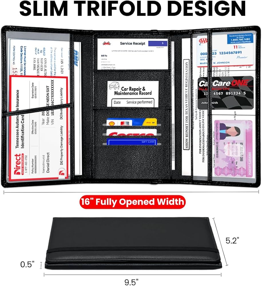 Slim Trifold – Compact Yet Spacious: This car registration and insurance holder uses a slim tri-fold design that expands to 16", saving space while holding all essential documents. It keeps paperwork tidy for everyday driving, ensures everything is travel-ready for long road trips, and provides instant access during traffic stops or roadside inspections—so documents are always ready when needed. A reliable car insurance and registration card holder and durable car registration holder