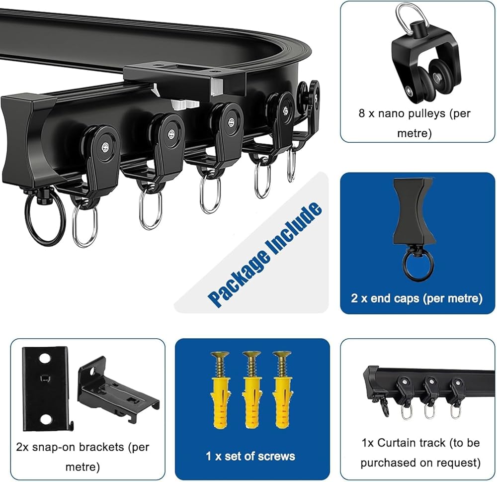 Comprehensive Kit: the Curvedain Track Kit Includes Everything You Need for a Flexible and Versatileain Track. You Will Receive One Bendableain Track 8 Track Rollers (Per Metre) 2Ap-In Ceiling and Wall Brackets (Per Metre) 1 Set of Expansscrews