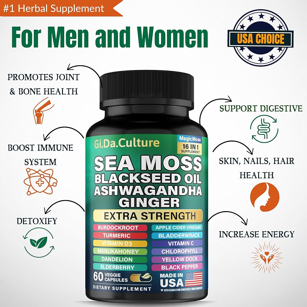 Experience lasting energy and vitality with Gi.Da.Culture Organic Sea Moss Capsules – a 120-count, two-month value pack crafted for both men and women. Our advanced formula blends Organic Irish Sea Moss with nature's most trusted superfoods: Black Seed Oil, Ashwagandha, Ginger, Burdock Root, Bladderwrack, Turmeric, Black Pepper, and added Vitamin C & D3. Whether you're tackling a busy workday or staying active with family, this comprehensive blend fuels your body and mind for consistent, long-term wellness.