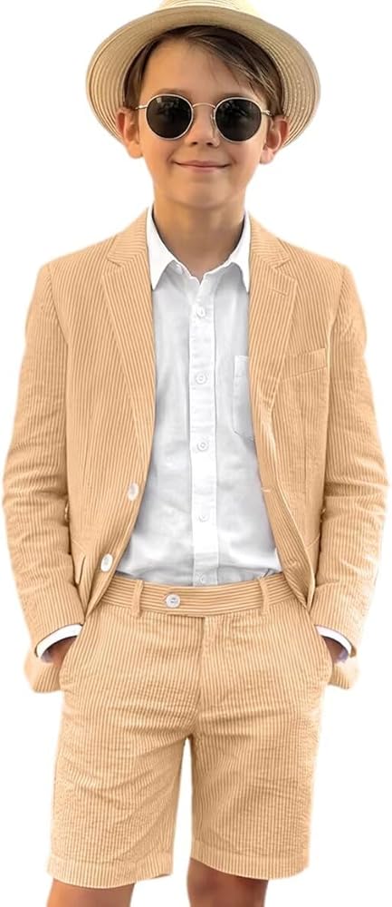 Boys Suit 2 Pieces-This Seersucker set includes a Seersucker jacket and matching suit shorts, made of 20% cotton and 80% polyester.Keeping boys cool even in hot weather (perfect for summer weddings, Easter or photography).