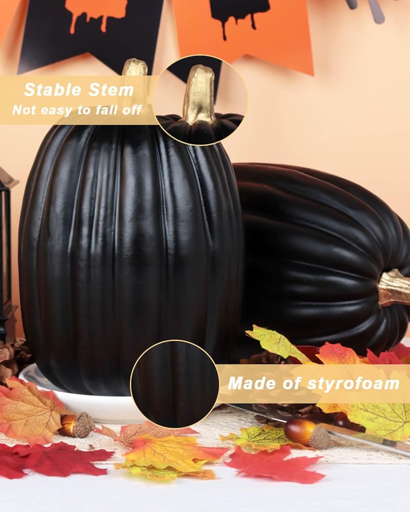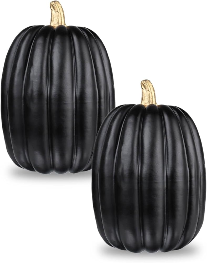 vensovo 8.5 Inch Large Black Pumpkins for Decorating - 2PCS Big Foam Decorative Pumpkin for Fall Decoration, Paintable Artificial Pumpkins Perfect for Halloween Thanksgiving Decor (Gold Handle)