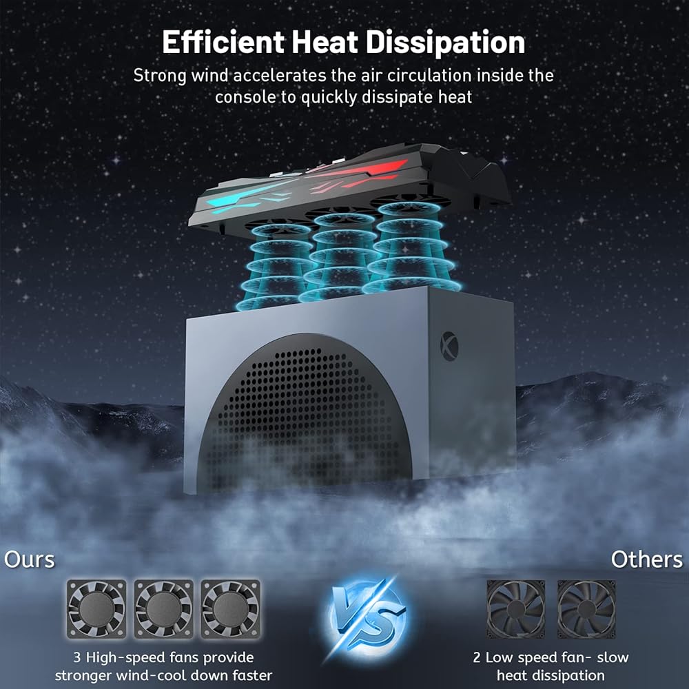 【Upgraded High-speed Cooling Fan】Unlike most fans with dual fan cooling system on the market, our fan has built-in three fan cooling system, which makes it have stronger wind to accelerate the air circulation inside the console and quickly reduce its temperature. This cooling fan for Xbox Series S can effectively prevent your console from overheating and prolong its lifespan.