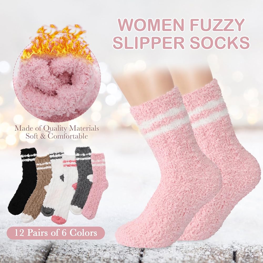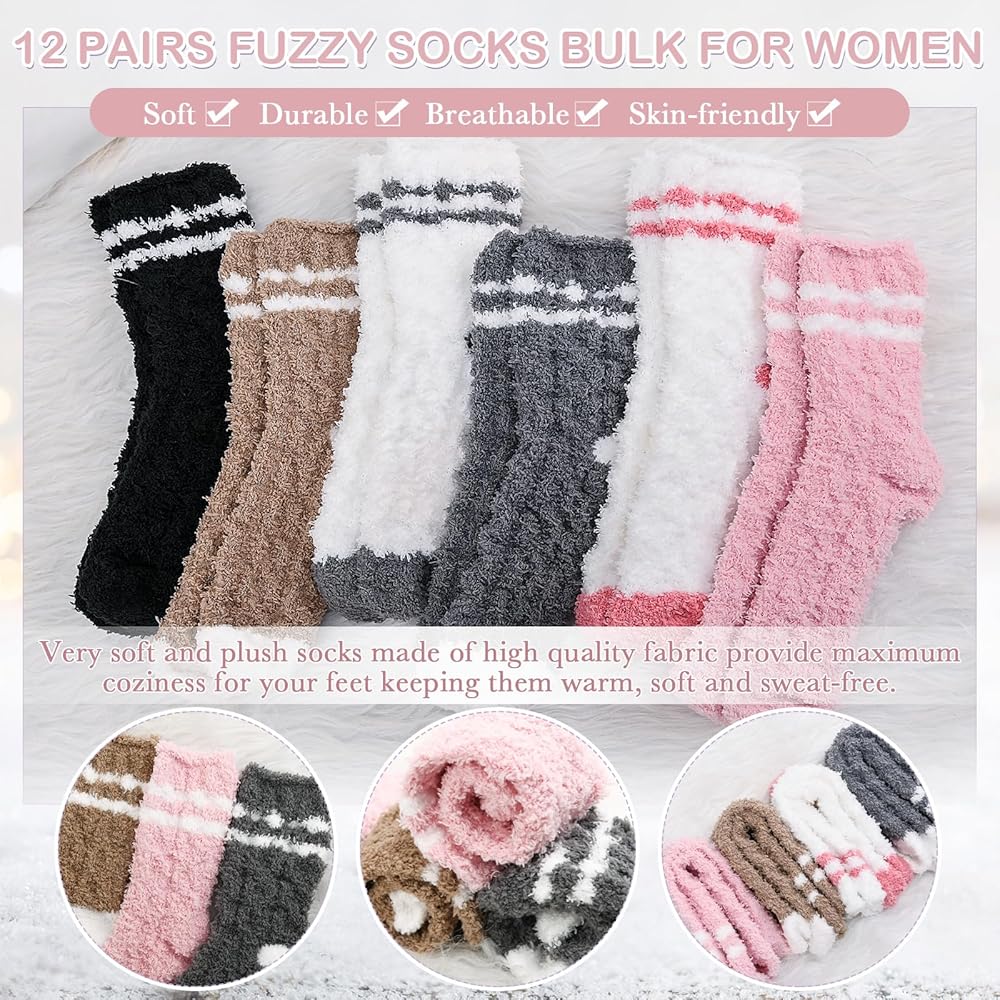 Comfort for Your Feet: indulge in comfort with our women's fuzzy socks crafted from soft coral fleece; The multicolor design adds a touch of fun, while the cozy material ensures your feet keep warm the whole day; With 12 pairs included, enjoy the fresh feel daily, flawlessly complementing any outfit