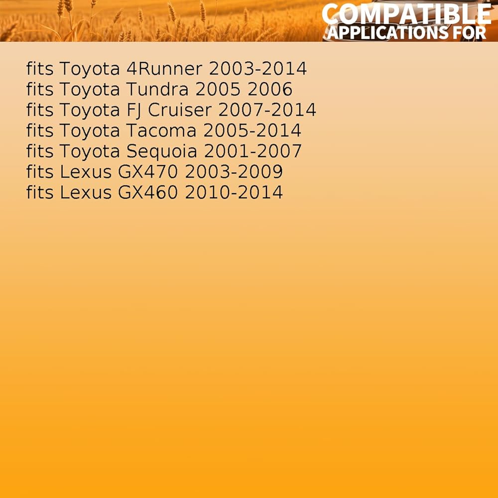 Fitment: Automatic Transmission Seal fits Lexus GX460 2010-2014 fits Lexus GX470 2003-2009 fits Toyota 4Runner 2003-2014 fits Toyota FJ Cruiser 2007-2014 fits Toyota Sequoia 2001-2007 fits Toyota Tacoma 2005-2014 fits Toyota Tundra 2005-2006