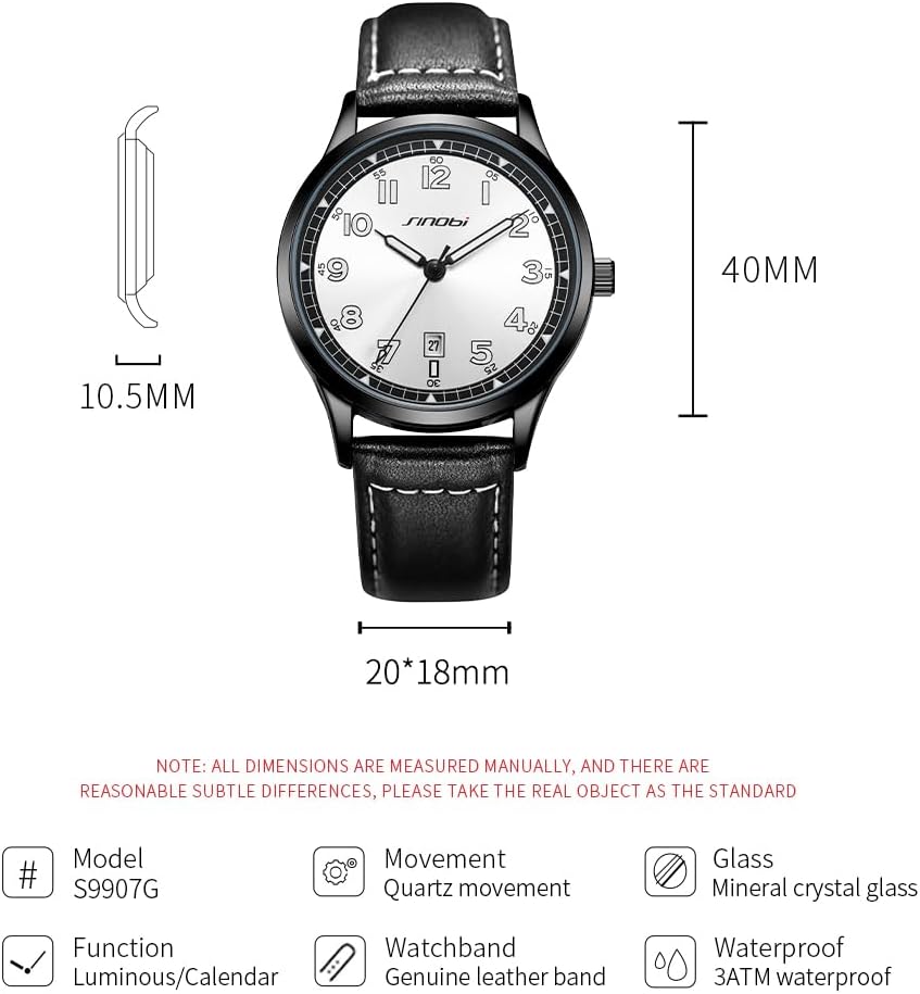 Classic Design: This men's watch is a classic pointer design, fine workmanship, comfort is its advantage, men's watch band width: 20 mm, case diameter,case thickness: 40,10.5 mm. wear adjustable range 150-210 mm, suitable for more men's wrists