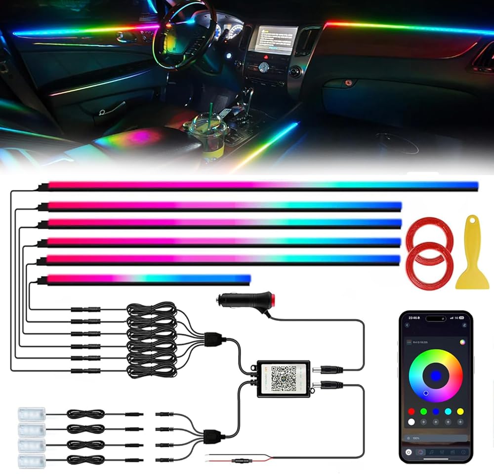 【High Bright & Uniform】The RGB Acrylic Light Strip have super bright LED and acrylic lens and contains 6 LED strips (4*29.5inch+1*43.3inch+1*14inch)+Foot well lamp*4(44.5inch*2/64.2inch*2), also comes with 1 main controller and 4 sub controllers,and can be flexibly installed on any car by DIY without disorganized, which is plug and play, and this acrylic light evenly spread over the lamp strip is brighter, more uniform and softer than other optical fiber lamps that rely on only one LED.