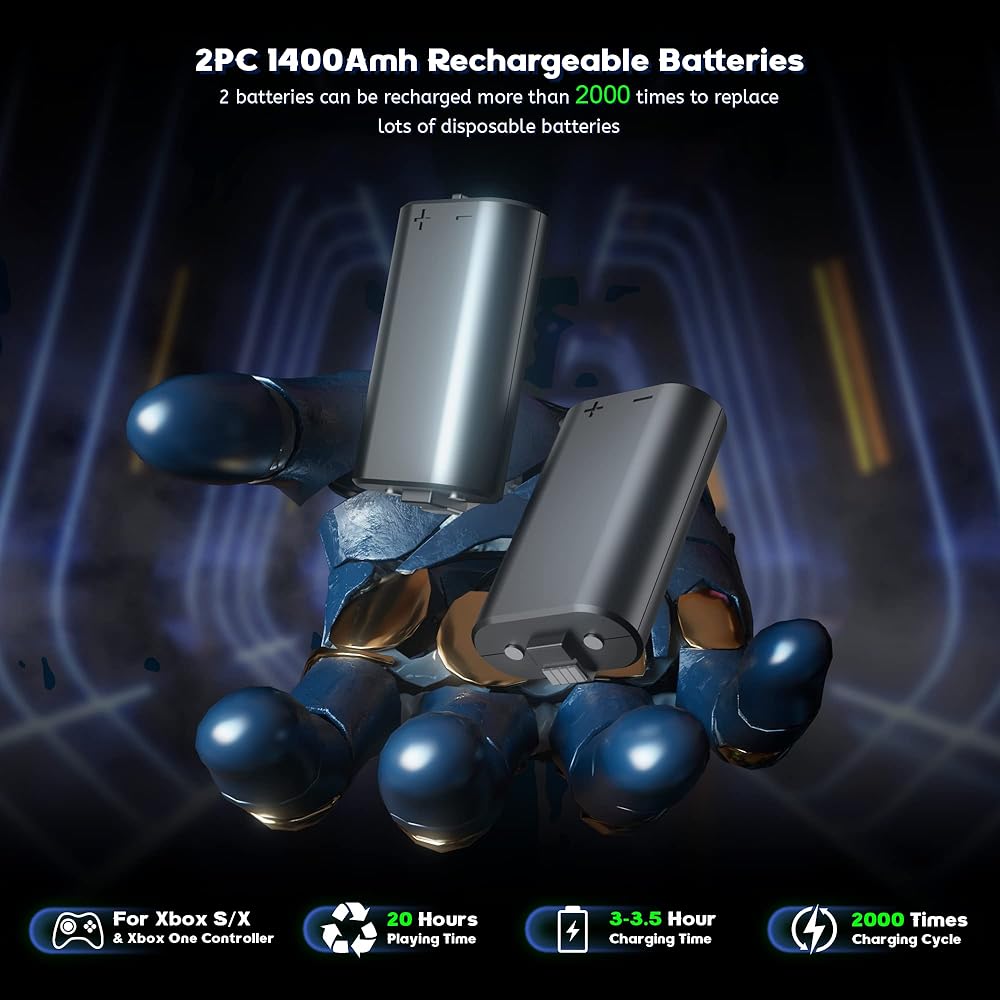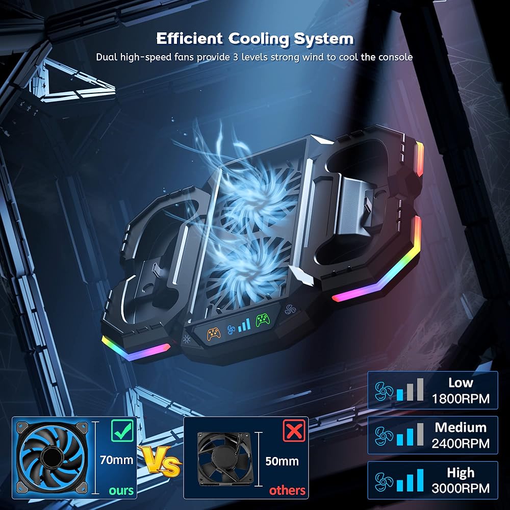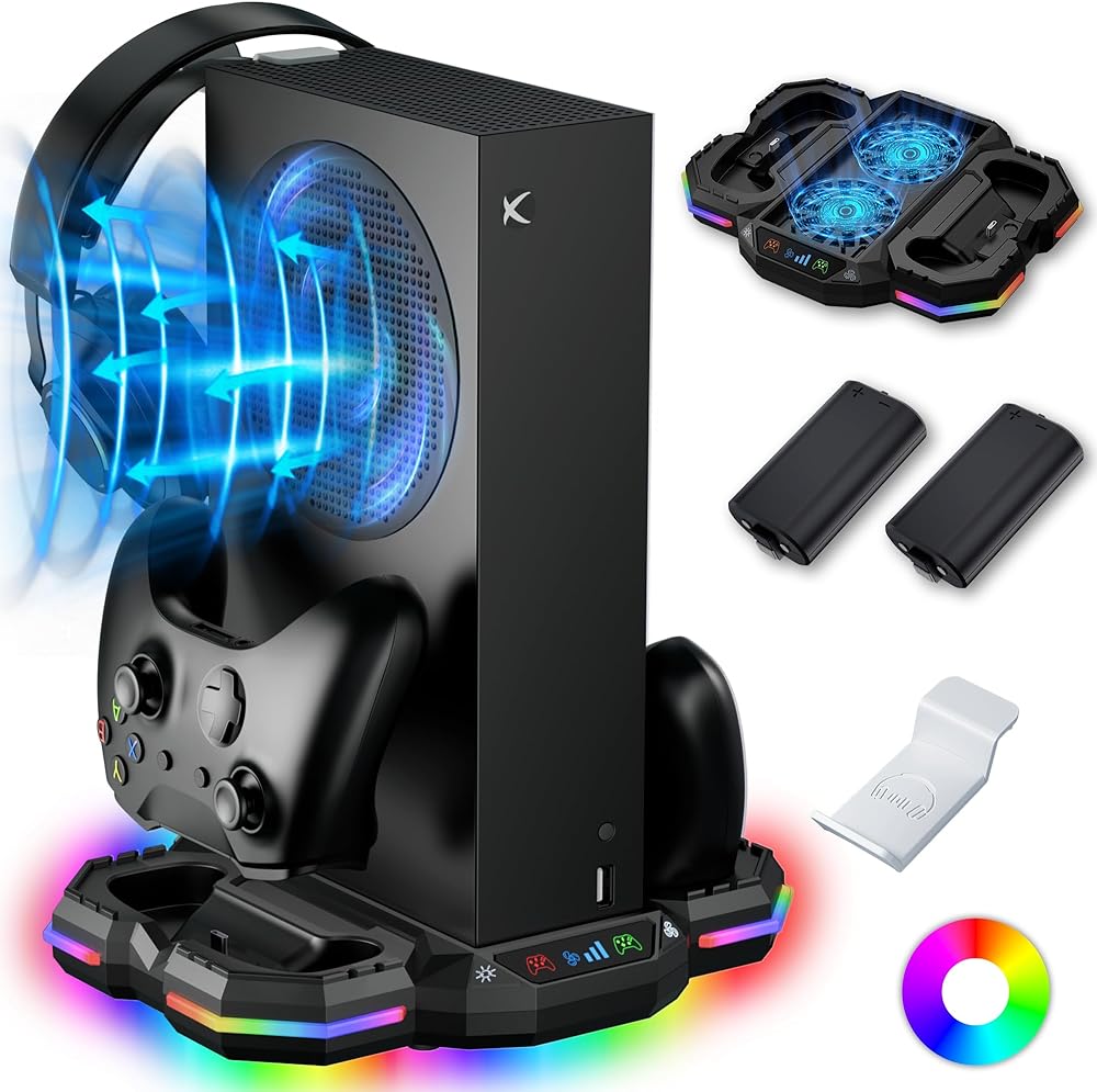 【Multi-functional Cooling Stand】This cooling stand with charging station is specially designed for Xbox Series S. This cooling stand has 2 high-speed fans, dual charging ports, 13 RGB light modes, headphone holder and 2*1400mAh rechargeable batteries for Xbox Series X/S controller. This charging stand with cooling fan can meet all your needs: including console cooling, controller charging, stunning light atmosphere, fast data transfer, gaming accessories storage.