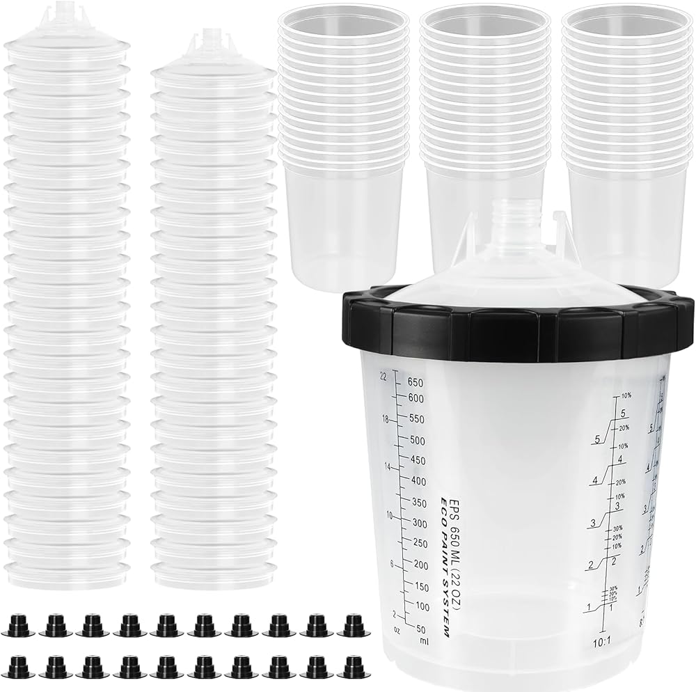 Complete Kit for Professionals – Includes 1×hard cup with retainer ring, 50×liners, 50×filter lids, 10×sealing plugs, and 1×paint stirrer for all your spray painting needs.