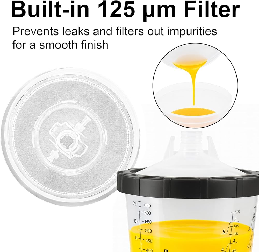 Quick Setup & Accurate Mixing – Reusable 600ml (20oz) hard cup with clear scale markings ensures precise paint measurement. Easy to install—just insert the liner, attach the filter lid, and secure with the retainer ring.