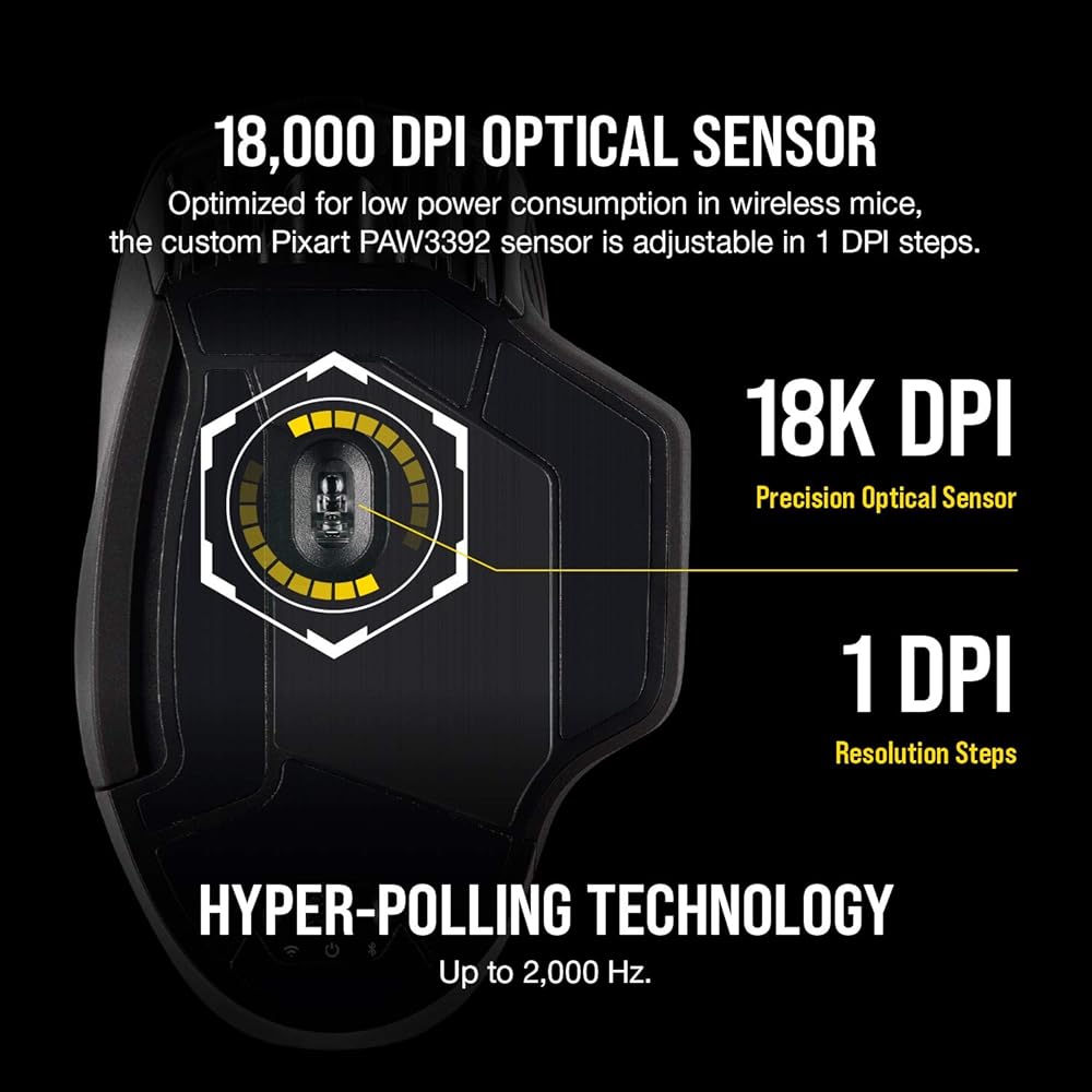 Play with pinpoint accuracy and precision thanks to a custom PixArt PAW3392 native 18,000 DPI optical sensor, optimized for wireless mice with extremely low power consumption and customizable in 1 DPI resolution steps.