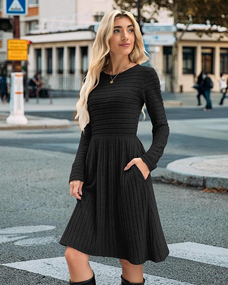 【Features】Perfectly capturing the essence of early fall fashion, this 2025 sweater dress for fall features a classic crewneck, long sleeve, and convenient side pockets. This must-have among fall dresses for women enhances your figure with its elegant silhouette while masterfully combining style, comfort, and practicality.