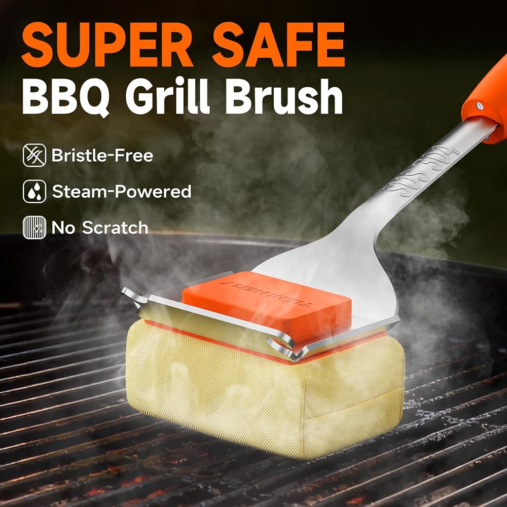 No Bristles, No Worries - Still worried about bristles left on the grill before each BBQ? Use our bristle-free grill brush and steam (quickly soften grill residue, with just water and heat, no harsh chemicals) to safely deep-clean your grill, completely eliminating the risk of swallowing wire bristles. Definitely a great alternative to traditional wire brushes