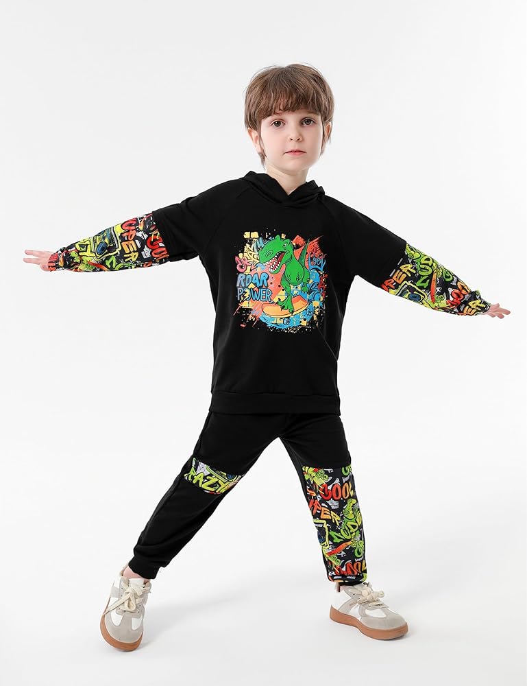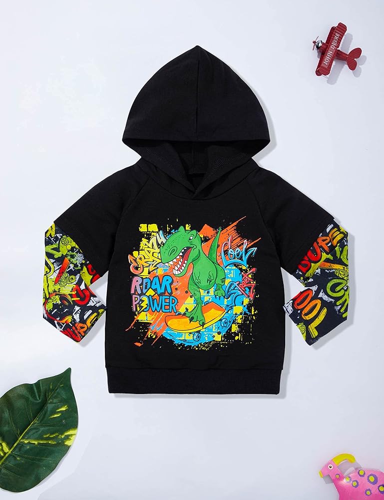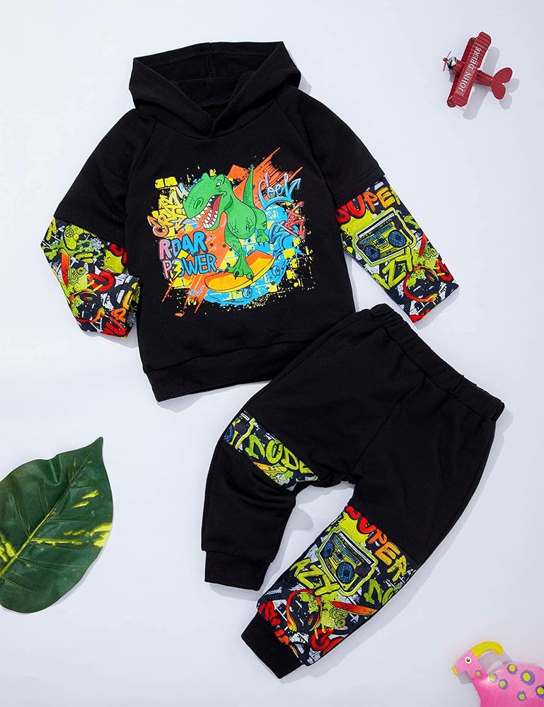 🦖【Special Design】This cute baby boy everyday-classic pullover hoodie sweatshirt features long sleeves,dinosaur printing pants is very cool for your baby boy,Print on the hat will make your baby the focus of the party,wide hem and cuffs to lock in warmth.