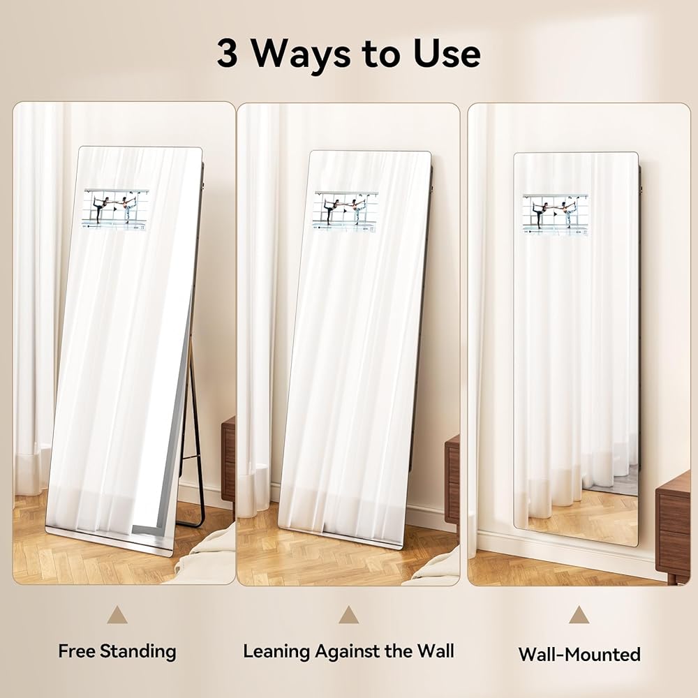 All-match - No assembly required. The floor full length mirror can stand anywhere with the standing holder. You can also lean it against a wall, or hang it vertically on the wall for space-saving. It's suitable for Dance studio, garage, home gym, etc.