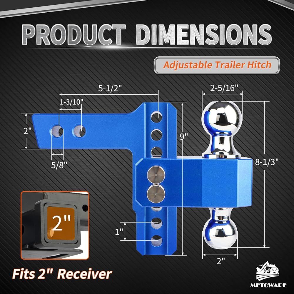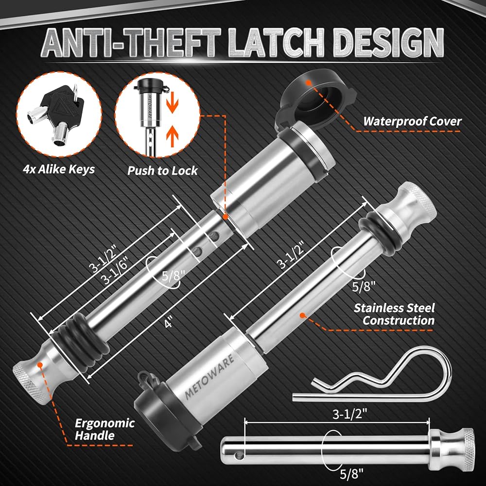 STRONG SECURITY - Each adjustable trailer hitch includes two sets of stainless steel locks with ergonomically designed handle for ease of use. The all-weather cover cap of our trailer hitch lock keeps the keyhole away from moisture, dust and rust. Equipped with 8 rubber O rings to reduce the abnormal sound caused by the contact between the shank and the receiver. High strength dual pin lock can ensure the safety of the trailer and the hitch when you leave the car.