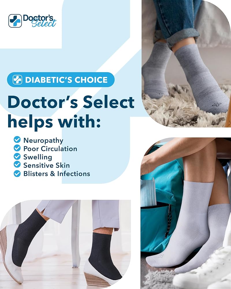 Gentle on Sensitive Feet - Doctor's Select diabetic socks feature smooth toe seams and an ultra stretch wide top to help reduce pressure, help with circulation, and prevent irritation, all for your maximum comfort.