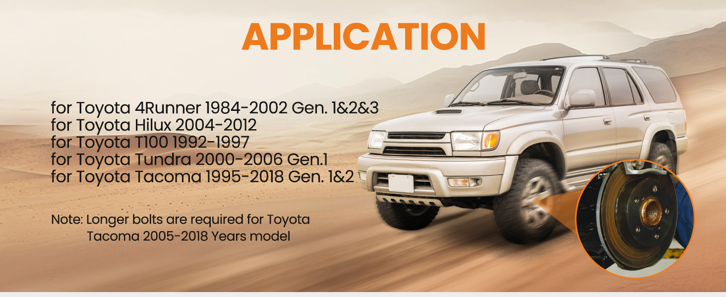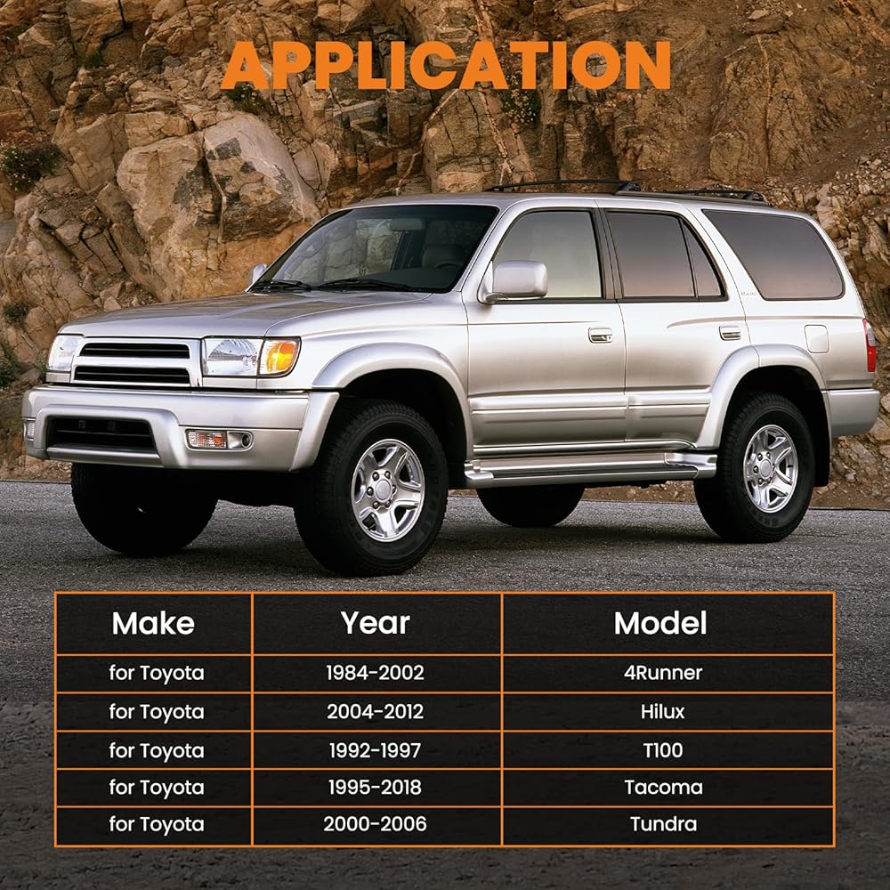 Fitment: Our bearing puller fit for Toyota 4Runner 1984-2002 Gen. 1&2&3, for Toyota Hilux 2004-2012, for Toyota T100 1992-1997, for Toyota Tacoma 1995-2018 Gen. 1&2, for Toyota Tundra 2000-2006 Gen.1