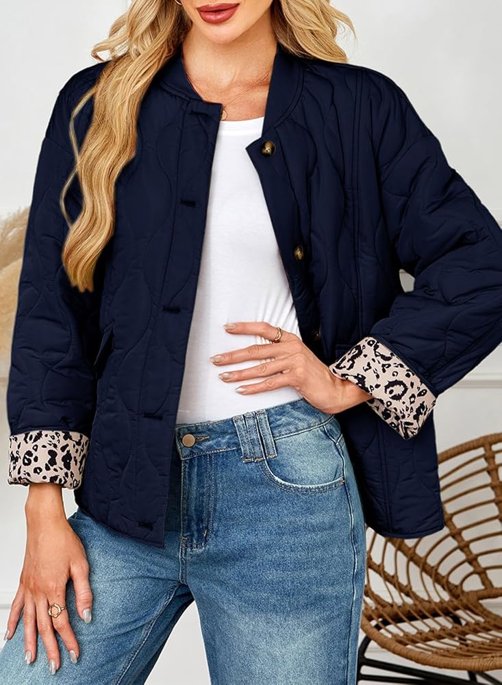 Features: Warm Winter Coat, Two Side Pockets, Long Sleeve, Insulated Jacket Coat, Drop Shoulder, No Collar, Leopard Printed, Crewneck, Fully Lined, Solid Color, Button Down Front Closure, Casual Style, Relaxed Fit Quilted Jacket