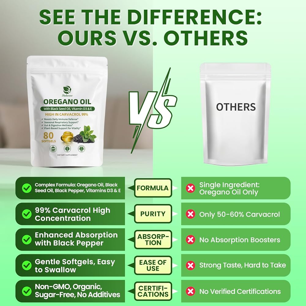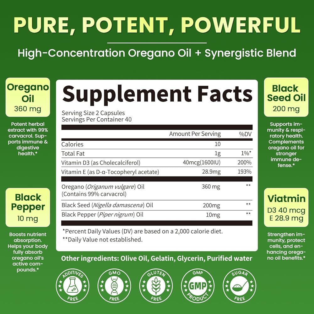 5-IN-1 Synergistic Organic Oregano Oil Capsules: oil of oregano with black seed oil for synergistic immune support, while Vitamin D3 boosts its seasonal benefits for year-round wellness. Black pepper enhances absorption (no nutrient waste), while Vitamin E preserves potency during uptake. This blend maximizes nutrient use, optimized for efficacy.