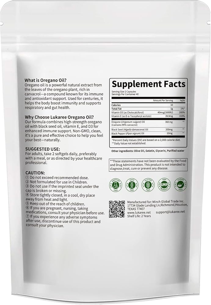 Each bag has 320 Oil of Oregano Softgels: covers 5+ months of daily use, no frequent restocks. It supports seasonal and long-term immunity: defends against harmful microbes, soothes bodily discomfort, and shields cells from oxidative harm. Eco-friendly packaging prevents capsule degradation/sticking, blending practicality and sustainability.
