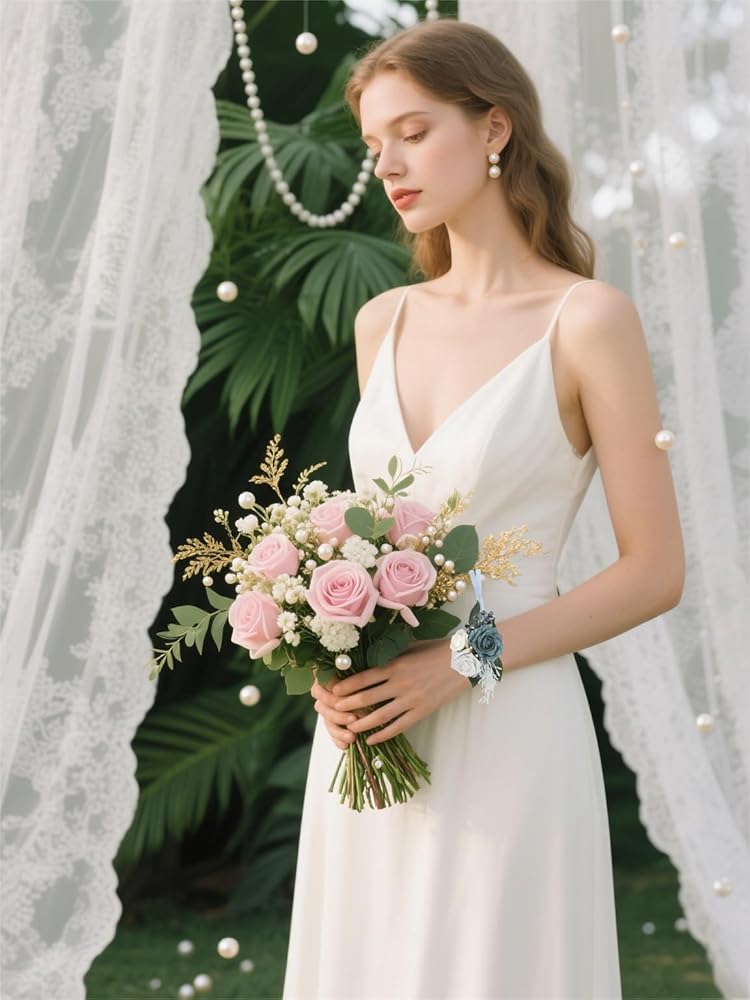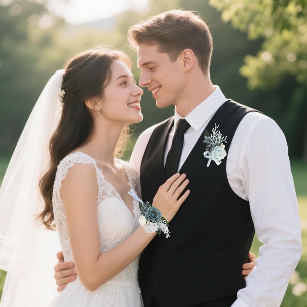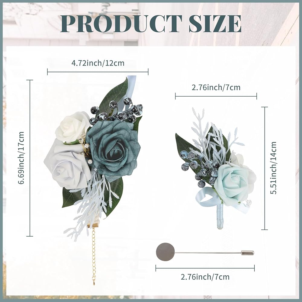 Comfortable Adjustable Fit: The corsage features a comfortable wristlet design with an adjustable fit, ideal for bridesmaids or the bride herself. The matching boutonniere easily attaches to any suit or tuxedo, providing a cohesive look for the groom, groomsmen or other formal participants