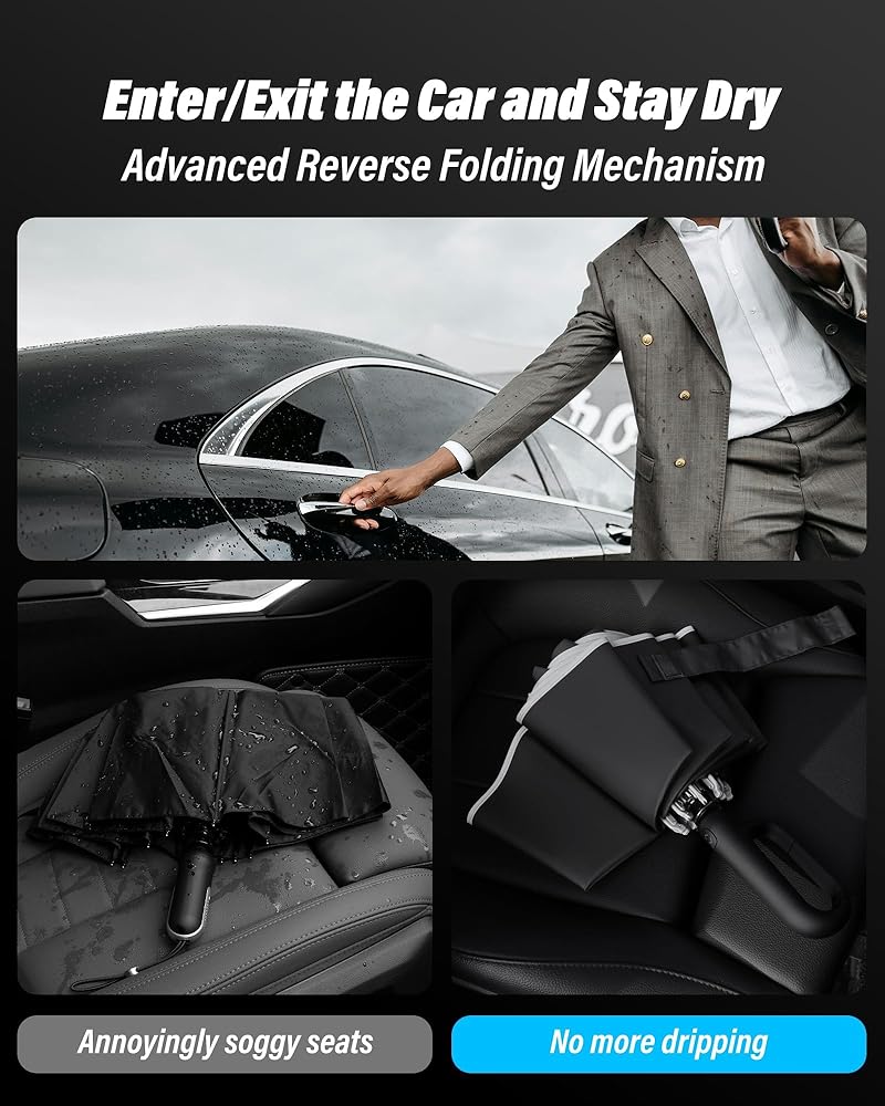 Advanced Reverse Folding Mechanism: Say goodbye to wet car seats and floors! Our umbrella folds in reverse, trapping the wet side inside and keeping the dry side out; this feature protects your surroundings from getting wet, making it perfect for entering and exiting your car on rainy days