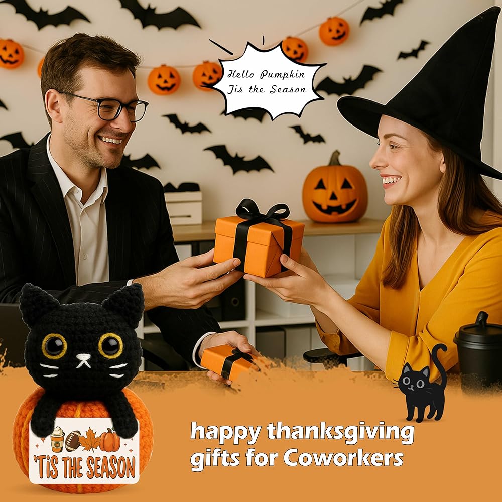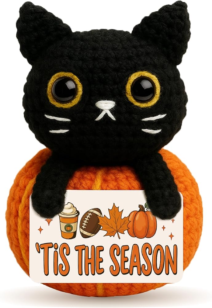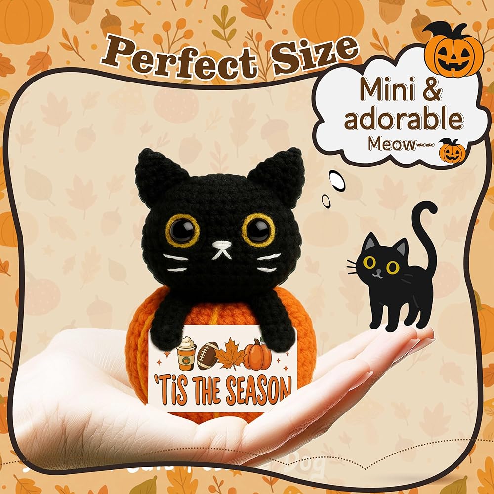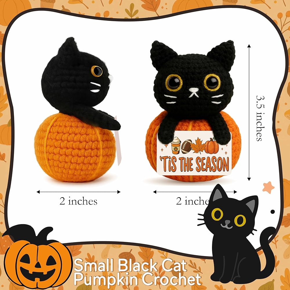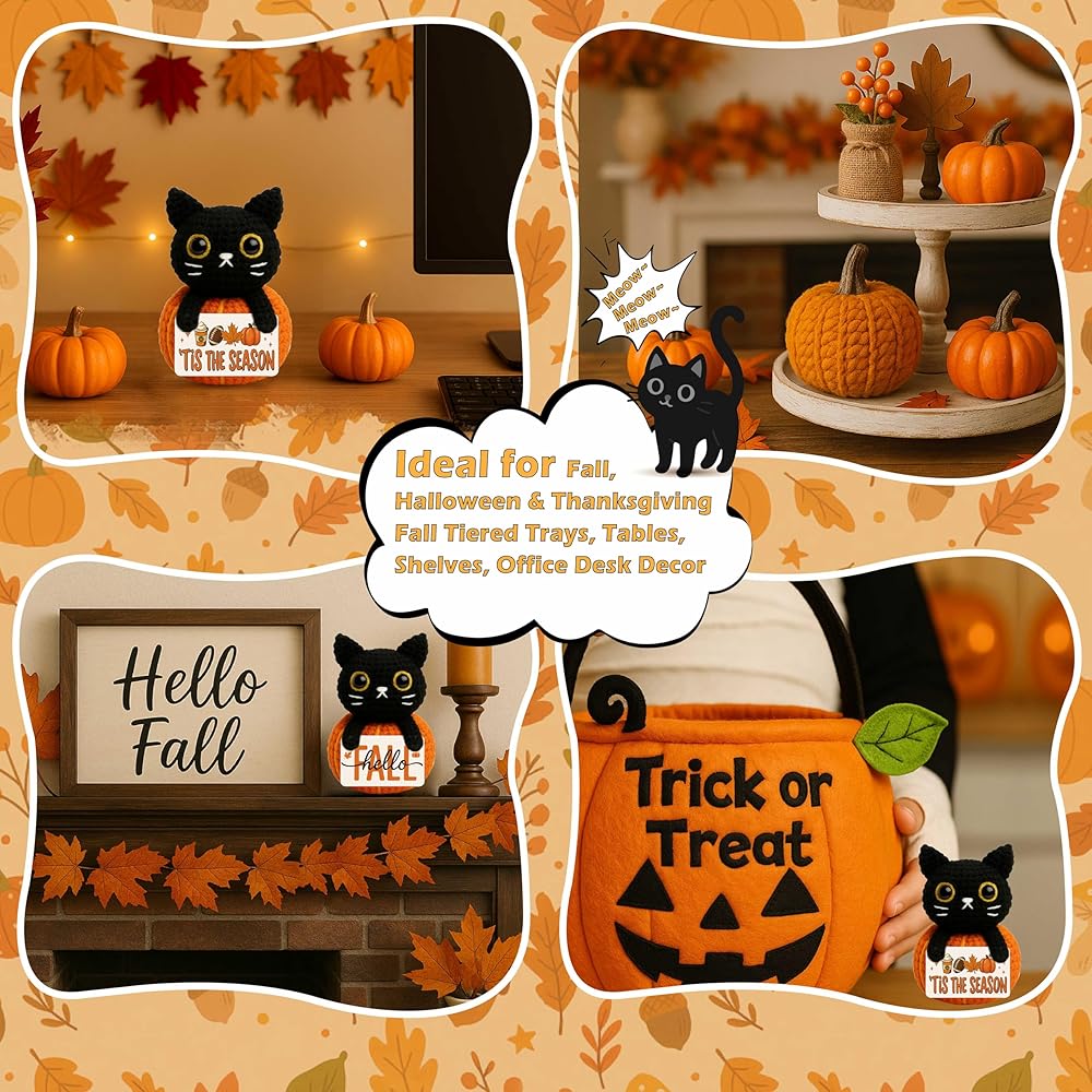 Bring cozy charm to your space with this handmade mini crochet black cat plush, sitting proudly on a pumpkin and holding a cheerful “hello fall” sign. Whether placed on a shelf, tiered tray, desk, or nightstand, it adds a warm, inviting autumn touch to any room. This cute and compact plush is a must-have for anyone who loves fall, collects pumpkins, or can't resist the charm of black cats. The soft yarn, stitched detail, and seasonal theme make it a heartwarming piece of decor that blends well with farmhouse, cozy-core, or cottage-style homes. It also makes a thoughtful fall gift for teachers, coworkers, friends, pumpkin lovers, cat enthusiasts, and anyone who enjoys decorating their space with autumn vibes and adorable handmade accents. Whether you're welcoming the season or giving a little joy to someone special, this crochet plush brings smiles, style, and seasonal spirit in one tiny package.