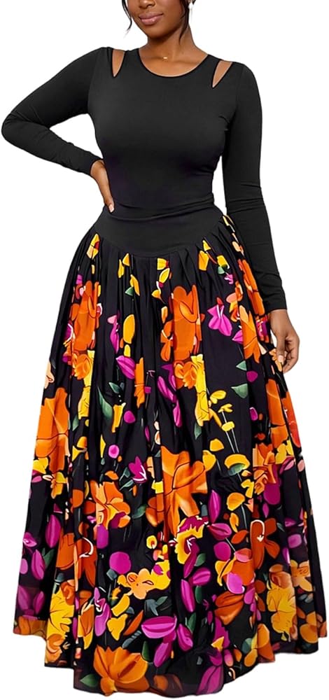 FEATURES: The elegant dress is a flowy maxi dress with a floral print. It features a crew neckline and long sleeves with cut out at shoulders, giving it an elegant look. Long Sleeves, Floor Length, Fit-and-Flare Silhouette, Flared Skirt, A Line, Skater, and a Swing Silhouette.