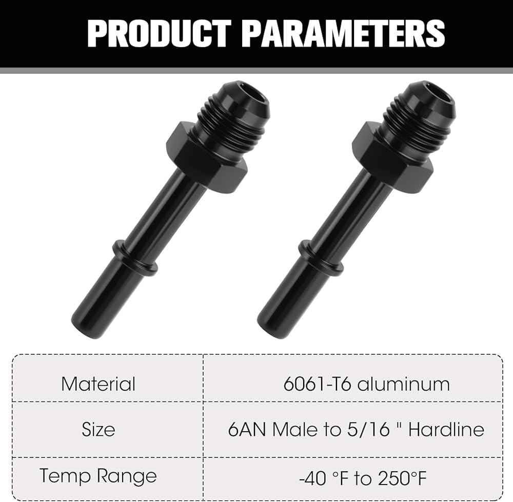 Whether you're upgrading your performance fuel system or optimizing an engine swap project, this set of quick connect fuel line fittings offers the reliability, durability, and versatility needed for seamless integration across a wide range of automotive applications. Engineered to streamline the connection between aftermarket fuel hoses and standard EFI components, these fittings ensure a secure and stable interface—making them ideal for both seasoned mechanics and hands-on enthusiasts. Crafted from premium-grade aluminum and treated with a corrosion-resistant black anodized coating, each fitting resists wear from fuel, oil, and heat exposure, ensuring long-term functionality even under demanding driving conditions. Built to withstand high operating pressures and extreme temperatures, these fittings maintain consistent performance in everything from daily commuters to track-tuned builds. Their precision-machined threads and flare-seal design offer enhanced fuel delivery stability, minimizing vibration-related loosening and promoting a leak-resistant connection throughout the fuel system. Whether you're working on a transmission cooler line, a return hose, or adapting your fuel delivery system to new components, this adapter set provides the flexibility to meet the challenge. Easy to install without specialty tools, it reduces setup time and risk of thread damage while offering broad compatibility with EFI platforms. Trusted by professionals across the automotive and performance tuning industries, this quick connect fitting set delivers a smart solution for those demanding efficiency, strength, and long-lasting quality. Enhance your engine's fueling system with confidence—choose components built for power, precision, and lasting results.