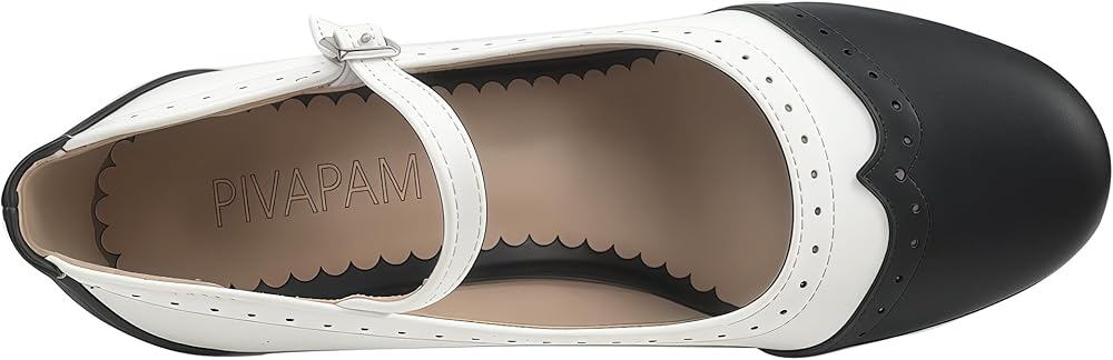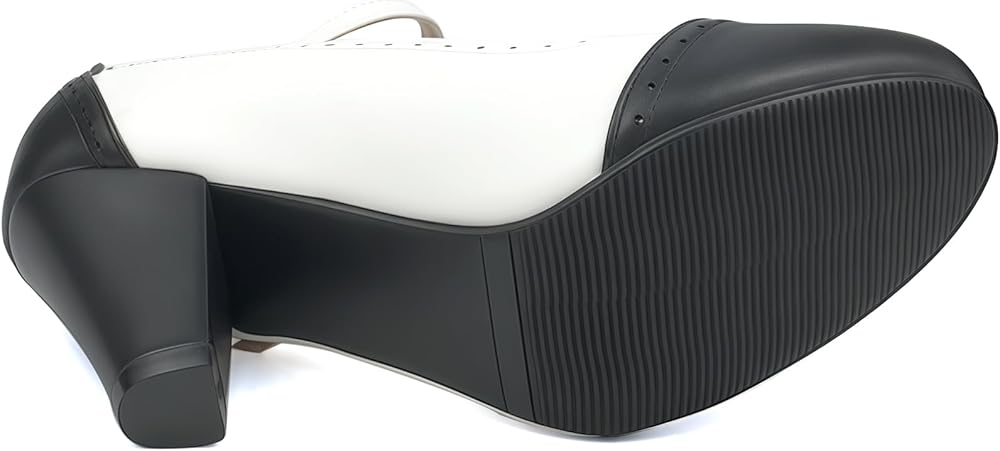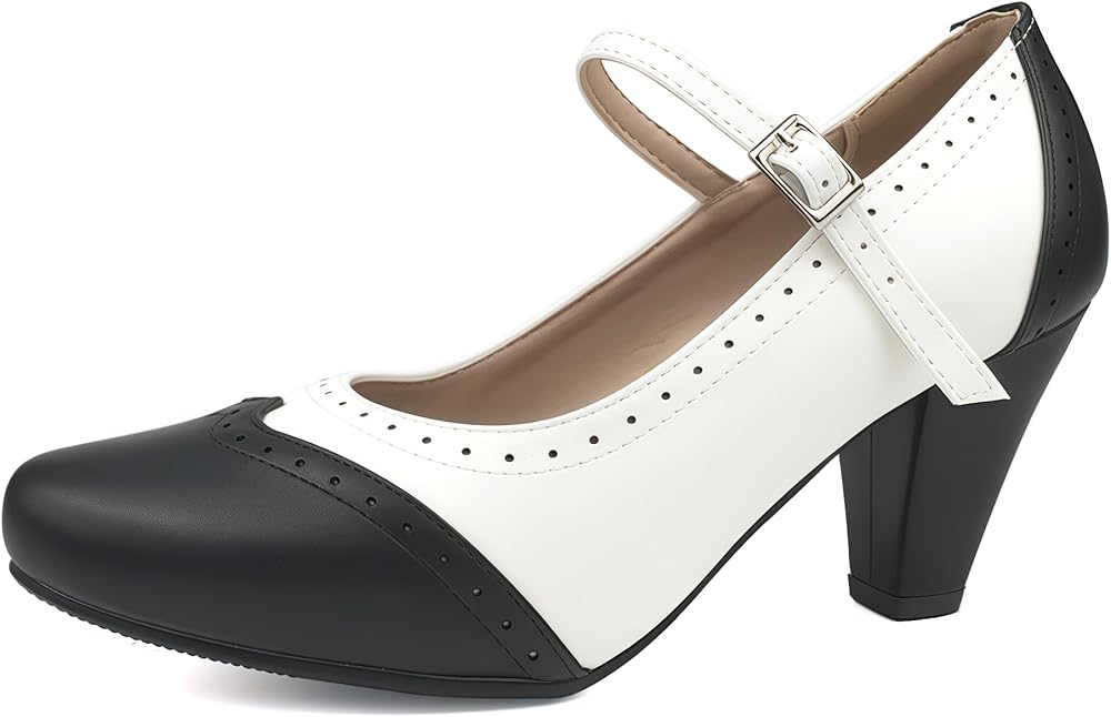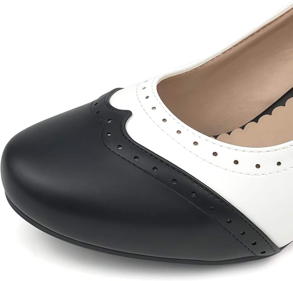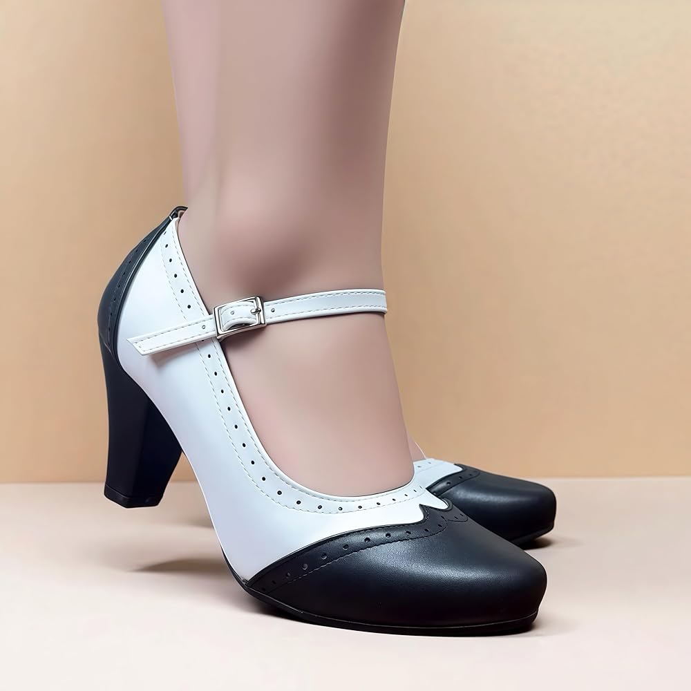 Wingtip Shoes Design: ankle buckle strap platform chunky high heels wingtip shoes womens with comfort round toe black and white saddle shoes.
