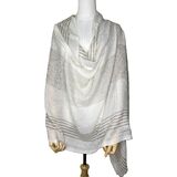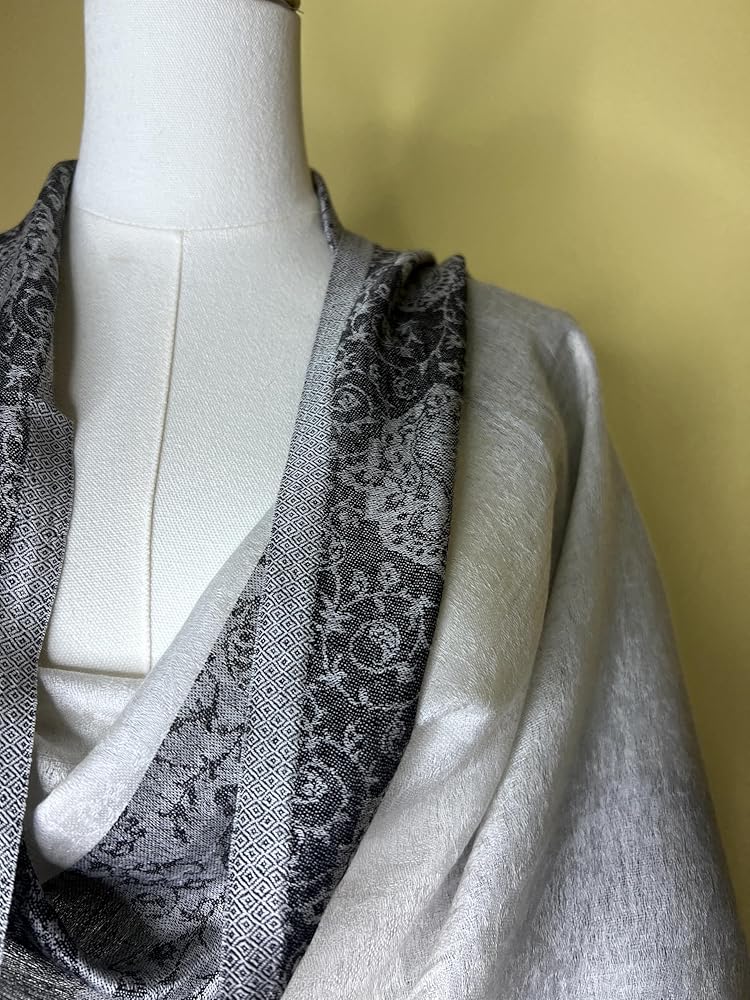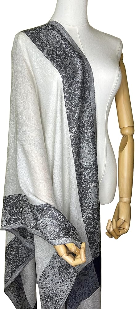 🔵 SIZE & SPECIFICATIONS Generous 83 inches long x 23 inches wide (210cm x 59cm) rectangular shawl offering versatile styling possibilities. Feather-light 1.4 oz (40g) weight perfect for year-round elegance. Hand-knotted fringes provide sophisticated finishing touch.