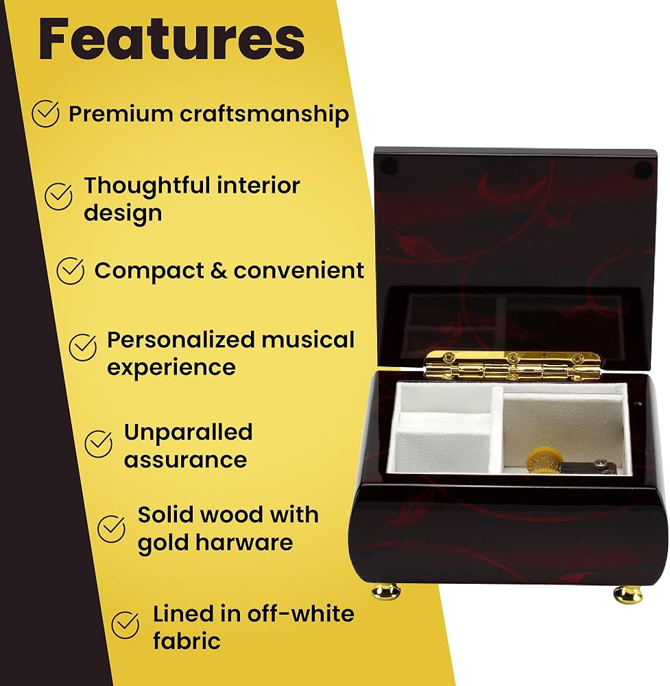 18-NOTE MECHANICAL MOVEMENT WITH 328 SONG CHOICES: This musical jewelry box features an 18-note movement with a selection of 328 different songs, allowing you to choose a melody that fits any mood or occasion. The smooth-playing mechanism delivers a crisp, enchanting tune every time the lid is opened.