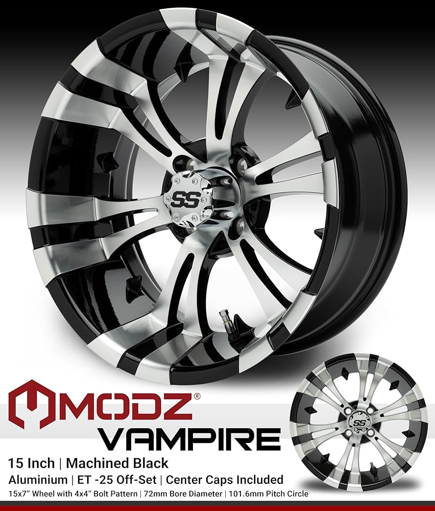Industry-Leading Wheels: MODZ 15" Vampire Chrome Golf Cart Wheels are 15x7 with a 4x4 bolt pattern and ET -25 offset. All MODZ wheel and tire combos are professionally mounted at our state-of-the-art facility. Every combo set is carefully inspected by our wheel and tire experts before being shipped to your door.