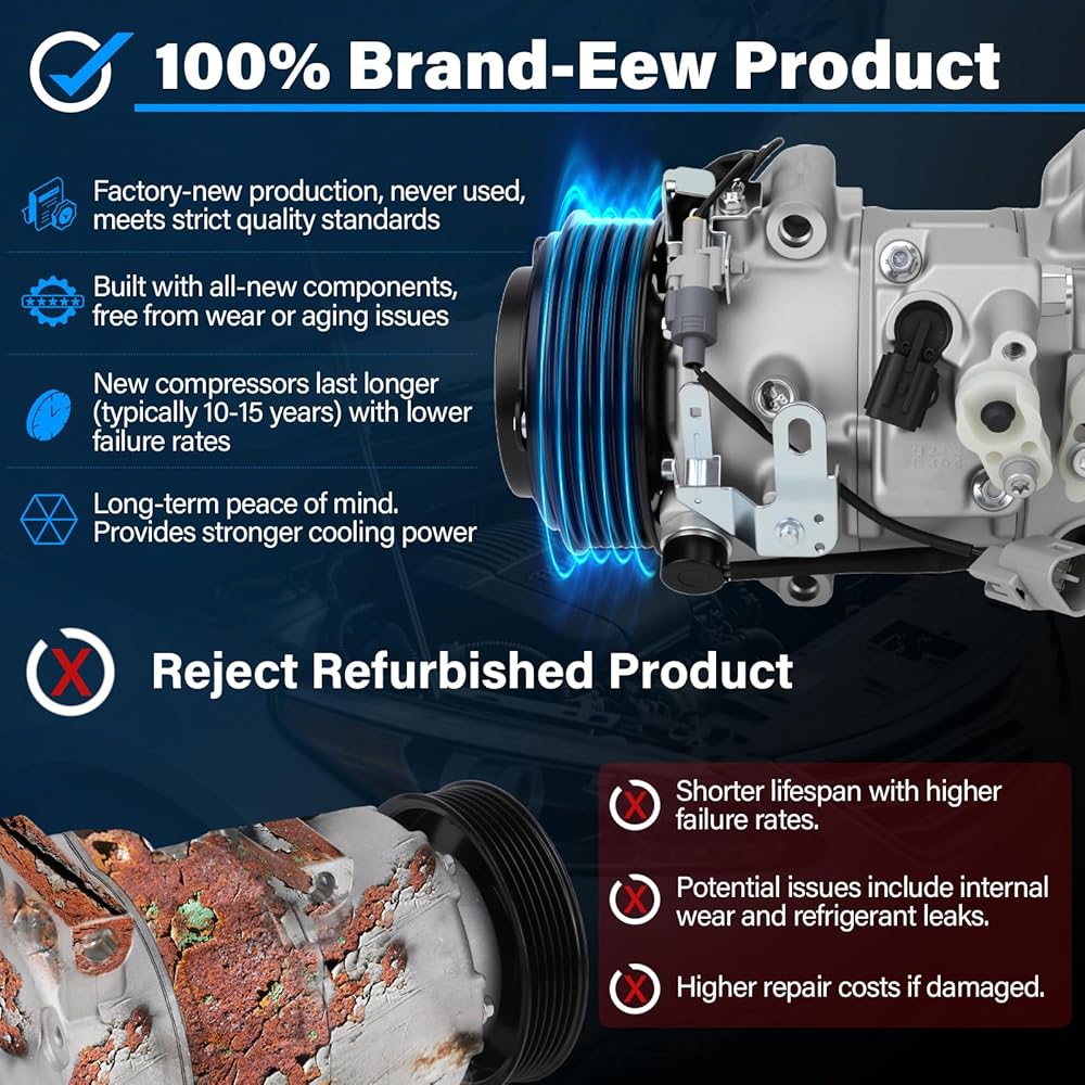 New OEM products — Brand New Air Conditioner A/C Compressor Lasts 30% Longer Than Refurbished product, 100% Vehicle-Specific Fit,Lower Failure Rate for Worry-Free Performance, Mechanically tested prior to leaving the factory ensures optimal performance and enhanced durability.