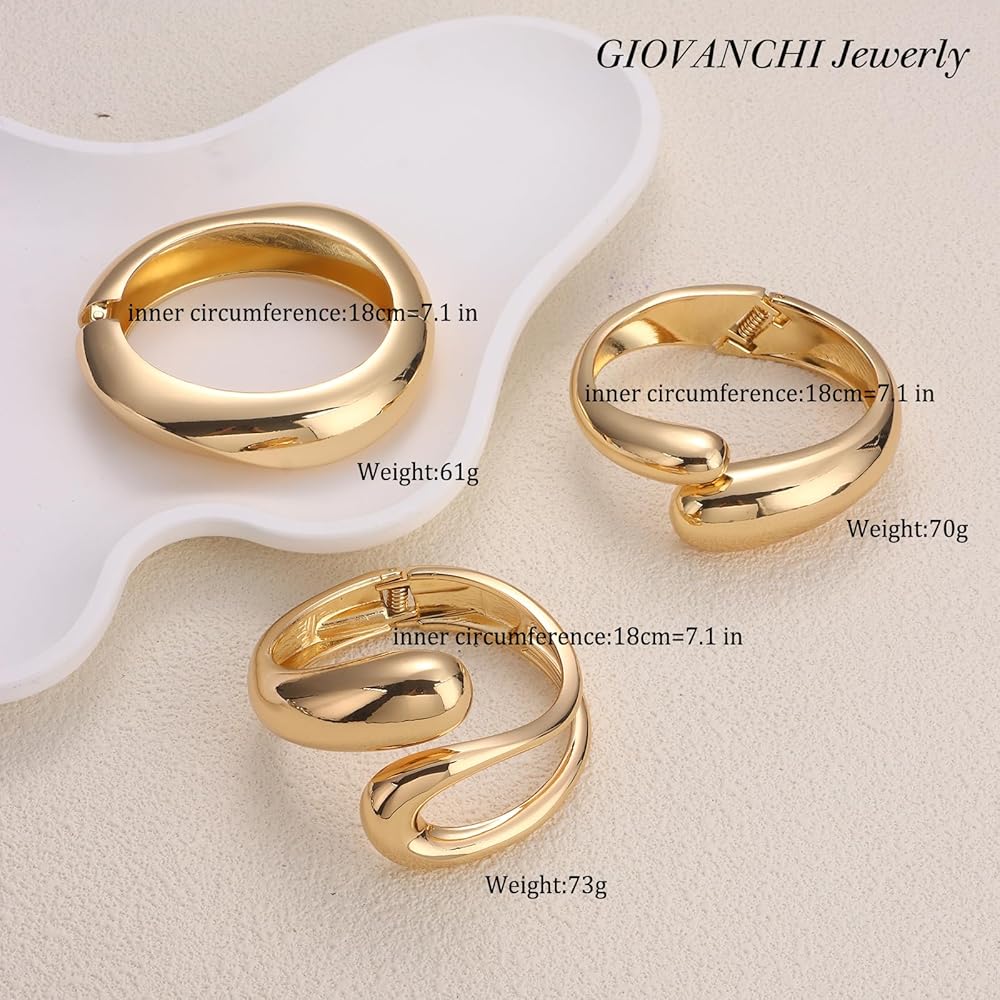 Trendy & Durable: Features twisted, hinged, or waterdrop designs with non-tarnish coating for long-lasting shine. 3Pcs Chunky bangles for versatile stacking or solo daily wear