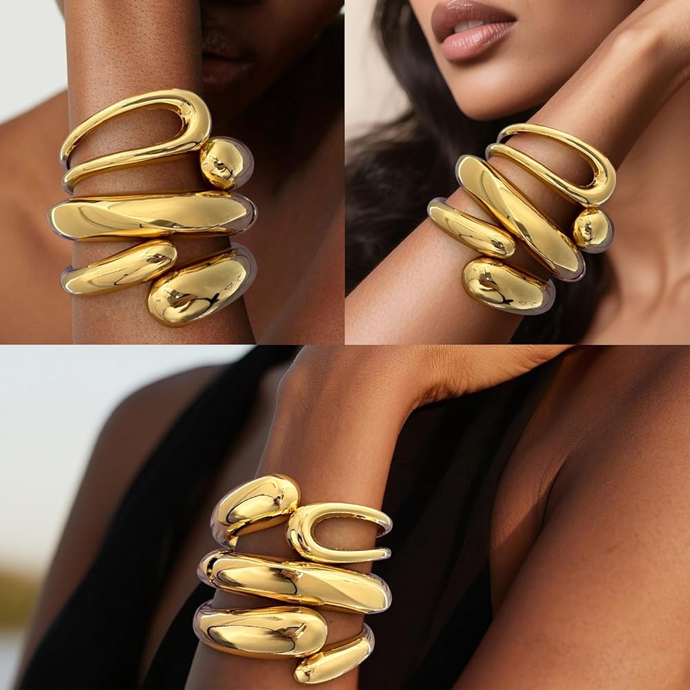 Chunky Cuff Bracelets Set (3 Piece) – Elevate your look with these bold yet minimalist open cuff bracelets. Featuring an irregular boho coil design and high-shine finish, they're perfect for stacking or solo wear. Adds instant edge to any outfit, from casual to night out. A must-have statement piece for trendsetters.