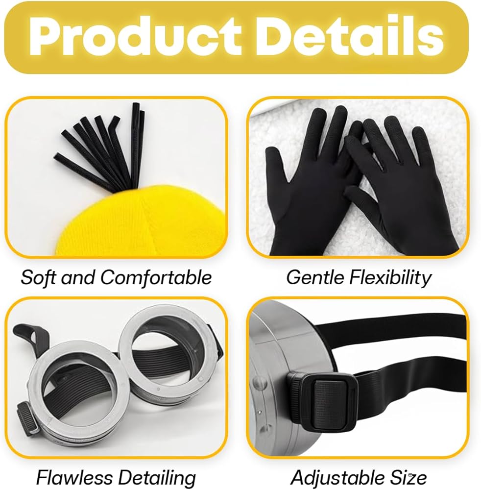Complete 3-Piece Costume Set: Transform instantly with this yellow-themed cosplay kit—includes a knit beanie with bendable hair stems, snug-fitting goggles with foam padding, and soft, stretchy gloves. Just add a yellow shirt and overalls!