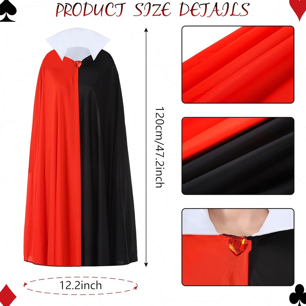 Our Halloween Queen Costume Set is a complete, high-quality ensemble that includes 1 red and black cloak, 1 satin glove, 1 crown, 1 heart-shaped wand, 1 pair of poker-themed stockings, 1 red heart necklace, 1 pair of heart earrings, and 1 clock earring—everything needed to effortlessly craft a regal queen look without the hassle of sourcing accessories separately. Each piece is crafted with care: the standing-collar cloak uses durable, smooth material for long-term use; the black satin gloves are wrinkle-free, odorless, and tightly stitched; and the poker-themed stockings, made of elastic, breathable nylon, stay secure during wear. Designed to fit most, the set comes in one size with a 47.24-inch cloak and 14.96-inch gloves, letting you step into queenly confidence with ease. Its classic yet charming design—featuring a sleek standing collar, poker-patterned stockings, and coordinating earrings—blends elegance and fun to ensure you stand out. Perfect for Halloween parties, poker-themed nights, and stage performances, the accessories also complement daily outfits for a playful touch, making this set a thoughtful gift for friends, partners, or cosplay enthusiasts.