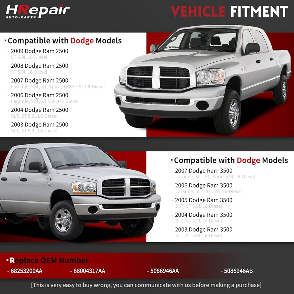• ✨ Vehicle Fitment: Direct replacement for Dodge Ram 2500 (2004-2009 L6 5.9L, 2007-2009 L6 6.7L, 2003-2009 V8 5.7L) & Ram 3500 (2004-2007 L6 5.9L, 2007-2009 L6 6.7L, 2004-2009 V8 5.7L).
