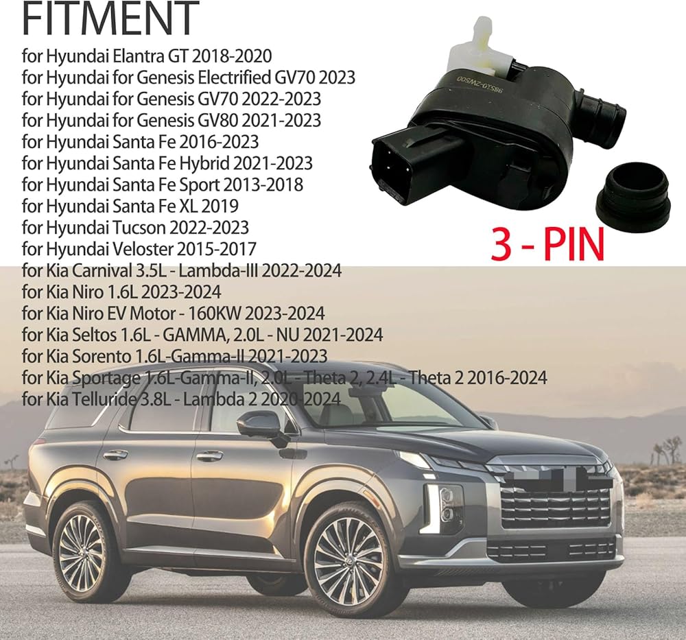 Model Fitment: Washer Pump For Hyundai Elantra GT 2018-2020, for Hyundai Genesis Electrified GV70 2023, for Hyundai Genesis GV70 2022-2023, for Hyundai Genesis GV80 2021-2023, for Hyundai Santa Fe 2016-2023, for Hyundai Santa Fe Hybrid 2021-2023, for Hyundai Santa Fe Sport 2013-2018, for Hyundai Santa Fe XL 2019, for Hyundai Tucson 2022-2023, for Hyundai Veloster 2015-2017,