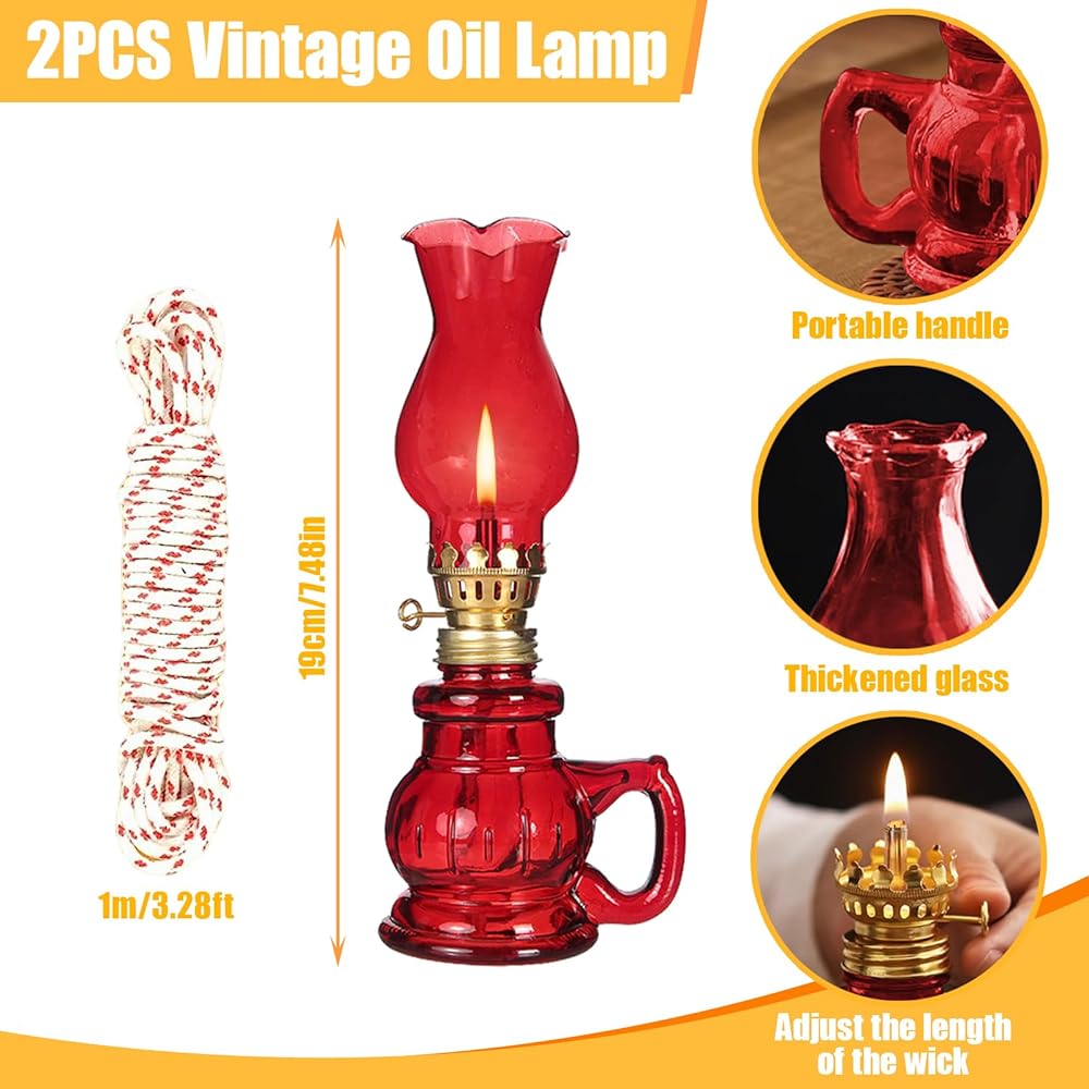 Specifications and materials: Oil lamp size 7.48×2.4 inches (height×bottom diameter), wick 5.51in and comes with a separate 4m/13.12ft wick; capacity about 100 ml; kerosene lamp consists of windproof glass lampshade, glass lamp holder and metal flame regulator