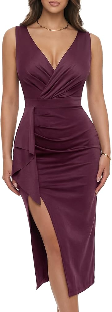 Chic Wraped Deep V-Neckline & Elegant Ruffle Hem: Designed with a refined crossover V-neck that frames the neckline more elegantly than a standard V, this sleeveless midi dress flatters the bust and shoulders. Finished with a thigh-high slit and cascading ruffle hem, it blends sexy appeal with graceful femininity.