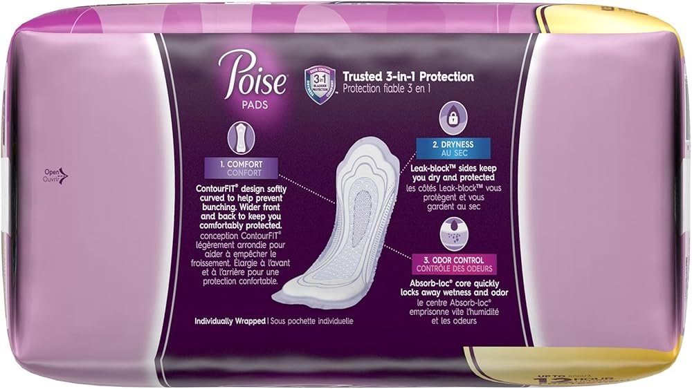 With trusted 3-in-1 protection for dryness, comfort and odor control, Poise Incontinence Pads now have a new ContourFit design to give you the confidence you need day or night for heavy bladder leakage protection. The front and back of the incontinence pads are wider to provide even more coverage where you need it the most, while the middle features a soft curve that will better conform to your natural body curves. Poise pads fit you better than before and stay 10x drier than leading period pads. Poise Maximum Absorbency Incontinence Pads are designed to handle those unexpected streams. This package contains individually wrapped Poise Maximum Absorbency Incontinence Pads in regular length. Poise is the number one brand for light bladder leaks.† †Based on Nielsen Market Share Data Frequently Asked Questions What is LBL? LBL stands for Light Bladder Leakage, and it affects millions of women. In fact, 1 in 3 women experience Light Bladder Leakage (LBL). LBL is the frequent involuntary leakage of urine. Why do I have bladder leaks? Some of the most common reasons for uninvited leaks include: • Physical changes from childbirth to menopause. • Being overweight. • Complications from surgery, stroke, or chronic diseases. • Bladder or urinary tract infections. • Bladder irritants. Can I prevent leaks? There are healthy habits you can maintain in order to help prevent leaks. • Track your triggers – Look for patterns in how your bladder reacts to certain spicy and acidic foods and beverages. • Exercise regularly - Reduce leaks by strengthening the muscles of your pelvic floor. • Drink more water – Drink six to seven 8-ounce glasses of water a day to prevent irritation. Can I use my FSA? Yes, you can. Poise products are FSA-eligible – only applicable in the US. Will my shipping box have what's inside written on it? No, it will not. All Poise maternity pads, bladder control pads and other incontinence products are shipped discreetly in a brown, corrugated box for your privacy.