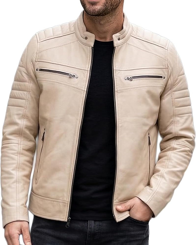 ► Size Guide: Our motorcycle style men's leather jacket is regular fit. If you're between sizes or plan to layer, consider sizing up. Check our size guide for more details of our cafe racer leather jacket for men.