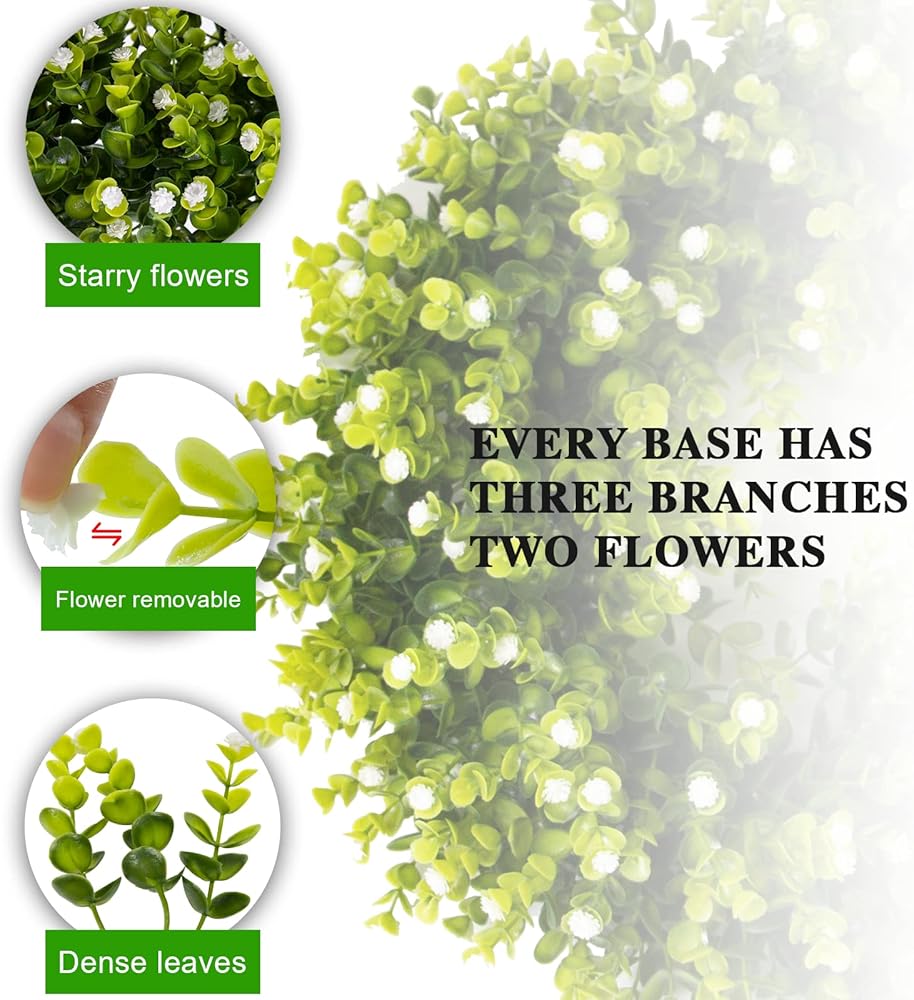 PREFERRED MATERIAL: Boxwood wreath of soft ight and dark green leafy branches and starry flowers are made of PE material with a sturdy round plastic ring on the back to effectively prevent the branches and leaves from falling off. UV & water protective and no fading.