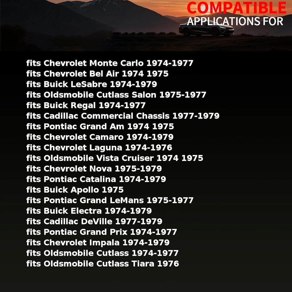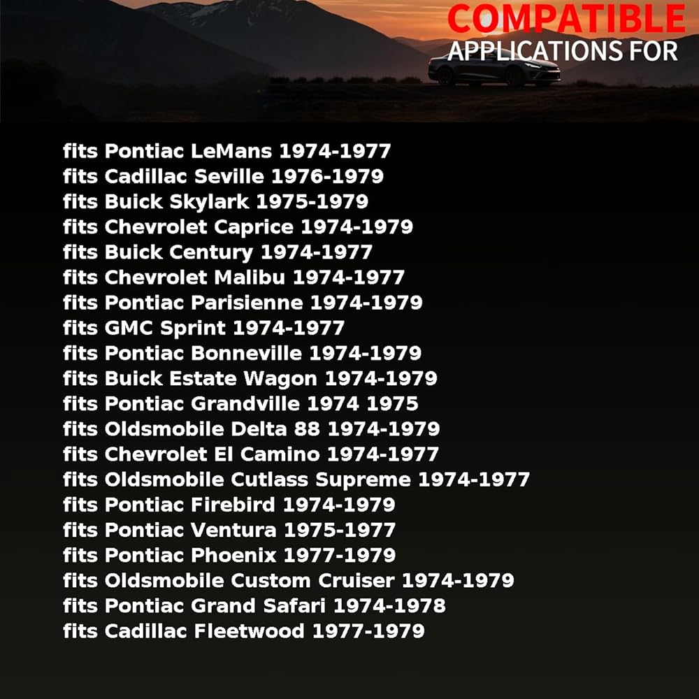 fits Chevrolet El Camino 1974-1977 fits Chevrolet Impala 1974-1979 fits Chevrolet Laguna 1974-1976 fits Chevrolet Malibu 1974-1977 fits Chevrolet Monte Carlo 1974-1977 fits Chevrolet Nova 1975-1979 fits GMC Sprint 1974-1977 fits Oldsmobile 98 1974-1979 fits Oldsmobile Custom Cruiser 1974-1979 fits Oldsmobile Cutlass 1974-1977 fits Oldsmobile Cutlass Salon 1975-1977 fits Oldsmobile Cutlass Supreme 1974-1977 fits Oldsmobile Cutlass Tiara 1976 fits Oldsmobile Delta 88 1974-1979