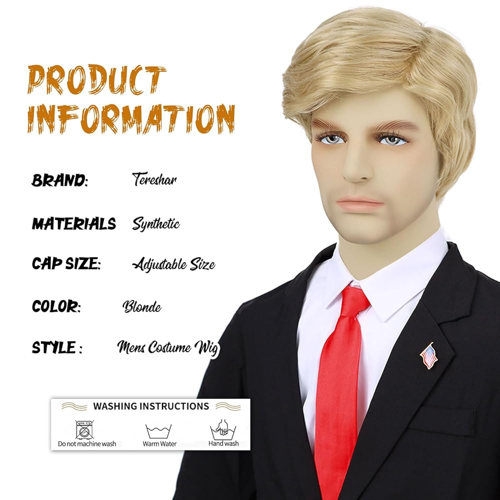 【Realistic Impersonation】4Pcs set: 1* Blonde costume wig + 1* Flag pin + 1* Red tie + 1* Wig cap. These accessories will be paired with some themed outfits to make the character you want to play come to life.